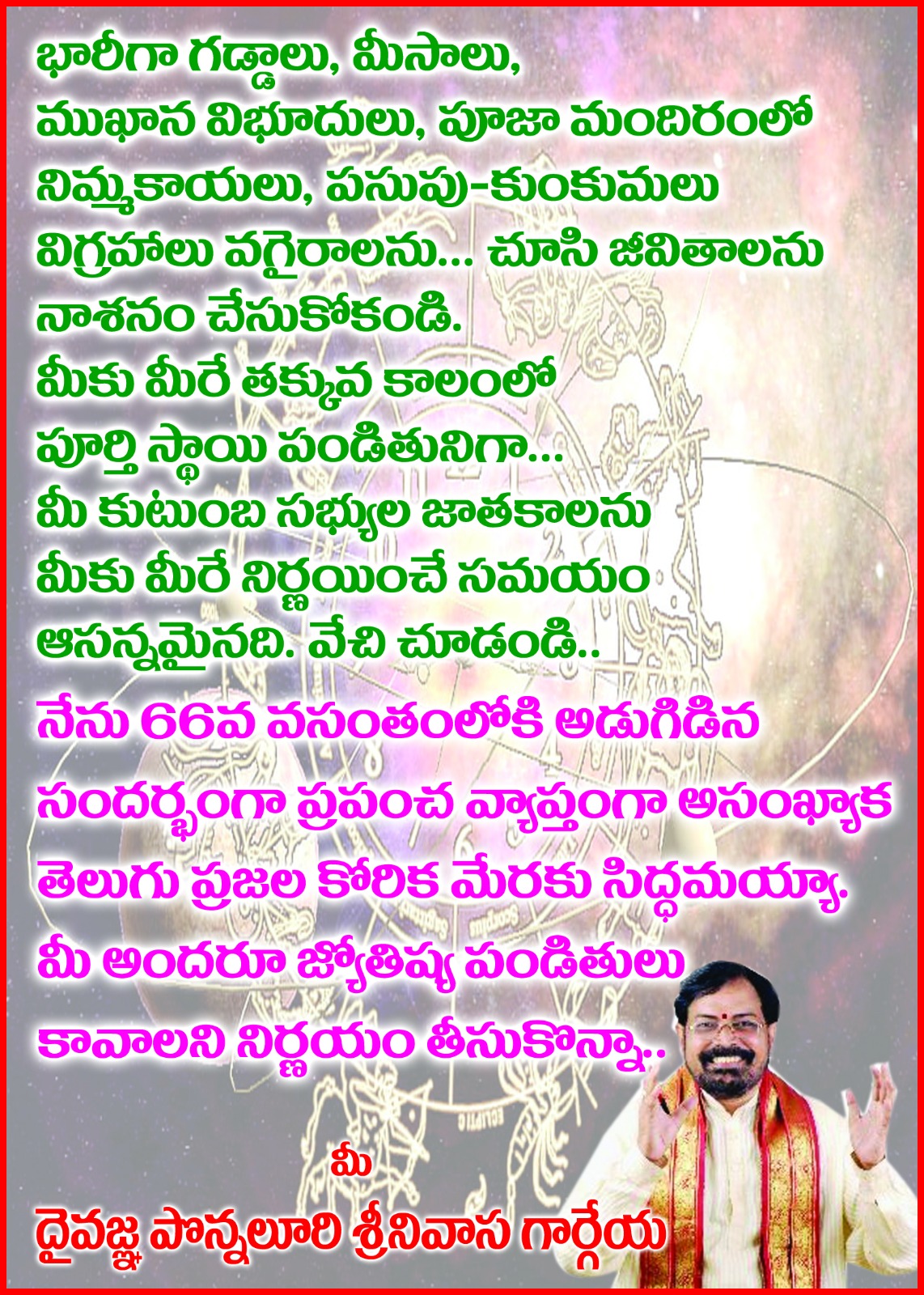 ArticlesAstrologyLatest మీ అందరూ జ్యోతిష్య పండితులు కావాలని నిర్ణయం తీసుకొన్న by gargeyaastro April 21, 2025 written by gargeyaastro April 21, 2025 535 1 comment 0 FacebookTwitterPinterestEmail gargeyaastro previous post Weekly panchangam 2025 April 19 – 23 next post Weekly Panchangam 2025 April 24-25 You may also like గోదావరి పుష్కరాలకు ఇదే ఖచ్చిత తేదీ December 16, 2025 శ్రీ చంద్రబాబు నాయుడు గారికి ధన్యవాదములు December 16, 2025 ప్రపంచవ్యాప్తంగా 2 ఆగస్టు 2026 నుంచి భవిష్య ఉద్యోగాలకు గండి... December 16, 2025 please call to 83410 32385 విజయవాడ 2026 జనవరి... December 16, 2025 Panchangam From Dec 11-15 2025 December 14, 2025 Panchangam From Dec 6-10 2025 December 6, 2025 ప్రజలను గందరగోళంలోకి నెట్టిన ఆంధ్రప్రదేశ్ ప్రభుత్వ పండుగల లిస్ట్ December 6, 2025 కేంద్ర ప్రభుత్వ సెలవుల క్యాలెండర్ విడుదలైంది December 6, 2025 కేంద్ర ప్రభుత్వ సెలవుల క్యాలెండర్ విడుదలైంది December 6, 2025 పంచాంగాలలో ఇచ్చే ఆదాయ వ్యయ నిర్ణయాలనేవి ఓ గుడ్డి పద్ధతి December 6, 2025 1 comment N V Ramanand April 22, 2025 - 4:33 pm If I send my date of birth time of birth and place of birth , would you send me my horoscope and forecast my future, without costly pariharams Reply Leave a Comment Cancel Reply Save my name, email, and website in this browser for the next time I comment.