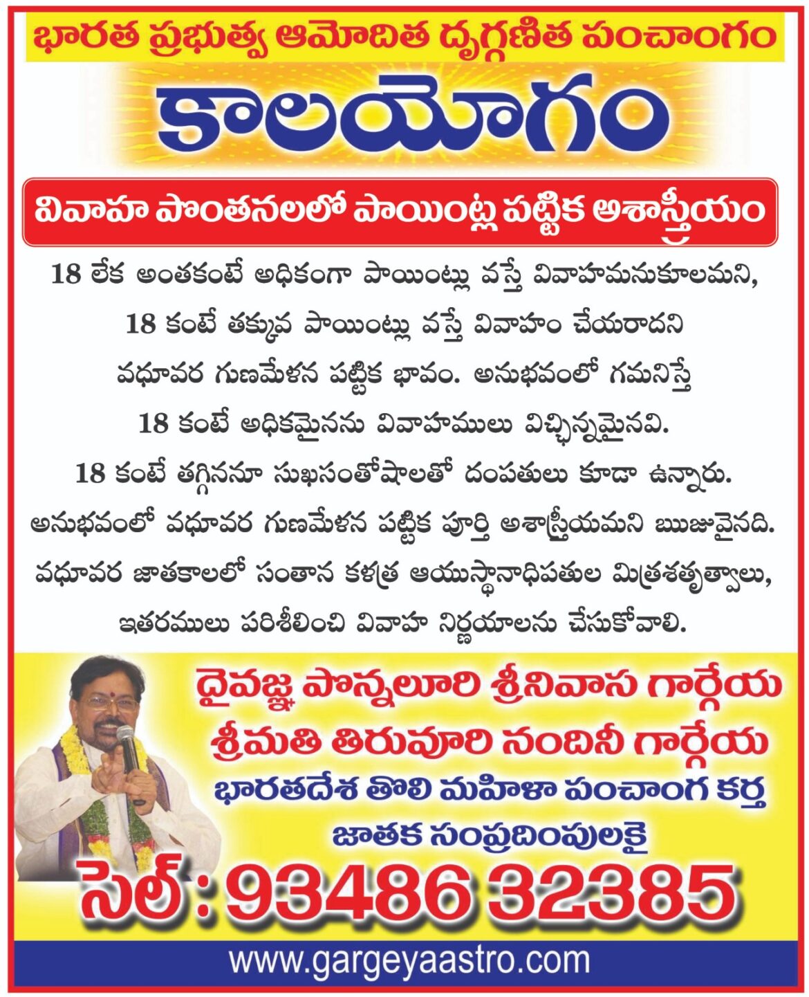 ArticlesAstrologyBlogsLatest వివాహ పొంతనలలో పాయింట్ల పట్టిక అశాస్త్రీయం by gargeyaastro April 28, 2025 written by gargeyaastro April 28, 2025 218 0 comment 0 FacebookTwitterPinterestEmail gargeyaastro previous post Weekly panchangam 2025 APRIL 26-27 next post For appointments fill contact forms in www.gargeyaastro.com You may also like గోదావరి పుష్కరాలకు ఇదే ఖచ్చిత తేదీ December 16, 2025 శ్రీ చంద్రబాబు నాయుడు గారికి ధన్యవాదములు December 16, 2025 ప్రపంచవ్యాప్తంగా 2 ఆగస్టు 2026 నుంచి భవిష్య ఉద్యోగాలకు గండి... December 16, 2025 please call to 83410 32385 విజయవాడ 2026 జనవరి... December 16, 2025 Panchangam From Dec 11-15 2025 December 14, 2025 Panchangam From Dec 6-10 2025 December 6, 2025 ప్రజలను గందరగోళంలోకి నెట్టిన ఆంధ్రప్రదేశ్ ప్రభుత్వ పండుగల లిస్ట్ December 6, 2025 కేంద్ర ప్రభుత్వ సెలవుల క్యాలెండర్ విడుదలైంది December 6, 2025 కేంద్ర ప్రభుత్వ సెలవుల క్యాలెండర్ విడుదలైంది December 6, 2025 పంచాంగాలలో ఇచ్చే ఆదాయ వ్యయ నిర్ణయాలనేవి ఓ గుడ్డి పద్ధతి December 6, 2025 Leave a Comment Cancel Reply Save my name, email, and website in this browser for the next time I comment.