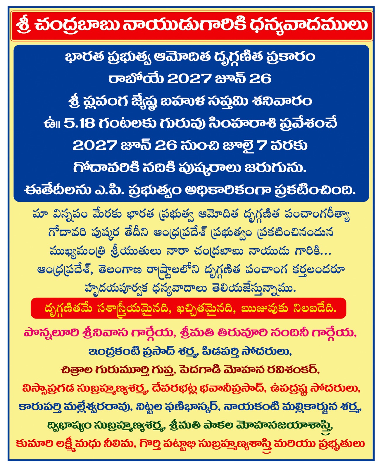 AstrologyLatestNitya Panchangam శ్రీ చంద్రబాబు నాయుడు గారికి ధన్యవాదములు by gargeyaastro December 16, 2025 written by gargeyaastro December 16, 2025 5 0 comment 0 FacebookTwitterPinterestEmail gargeyaastro previous post ప్రపంచవ్యాప్తంగా 2 ఆగస్టు 2026 నుంచి భవిష్య ఉద్యోగాలకు గండి పడనుందా..? next post గోదావరి పుష్కరాలకు ఇదే ఖచ్చిత తేదీ You may also like గోదావరి పుష్కరాలకు ఇదే ఖచ్చిత తేదీ December 16, 2025 ప్రపంచవ్యాప్తంగా 2 ఆగస్టు 2026 నుంచి భవిష్య ఉద్యోగాలకు గండి... December 16, 2025 please call to 83410 32385 విజయవాడ 2026 జనవరి... December 16, 2025 Panchangam From Dec 11-15 2025 December 14, 2025 Panchangam From Dec 6-10 2025 December 6, 2025 ప్రజలను గందరగోళంలోకి నెట్టిన ఆంధ్రప్రదేశ్ ప్రభుత్వ పండుగల లిస్ట్ December 6, 2025 కేంద్ర ప్రభుత్వ సెలవుల క్యాలెండర్ విడుదలైంది December 6, 2025 కేంద్ర ప్రభుత్వ సెలవుల క్యాలెండర్ విడుదలైంది December 6, 2025 పంచాంగాలలో ఇచ్చే ఆదాయ వ్యయ నిర్ణయాలనేవి ఓ గుడ్డి పద్ధతి December 6, 2025 గోదావరి పుష్కరాలకు ఇదే ఖచ్చిత తేదీ December 6, 2025 Leave a Comment Cancel Reply Save my name, email, and website in this browser for the next time I comment.