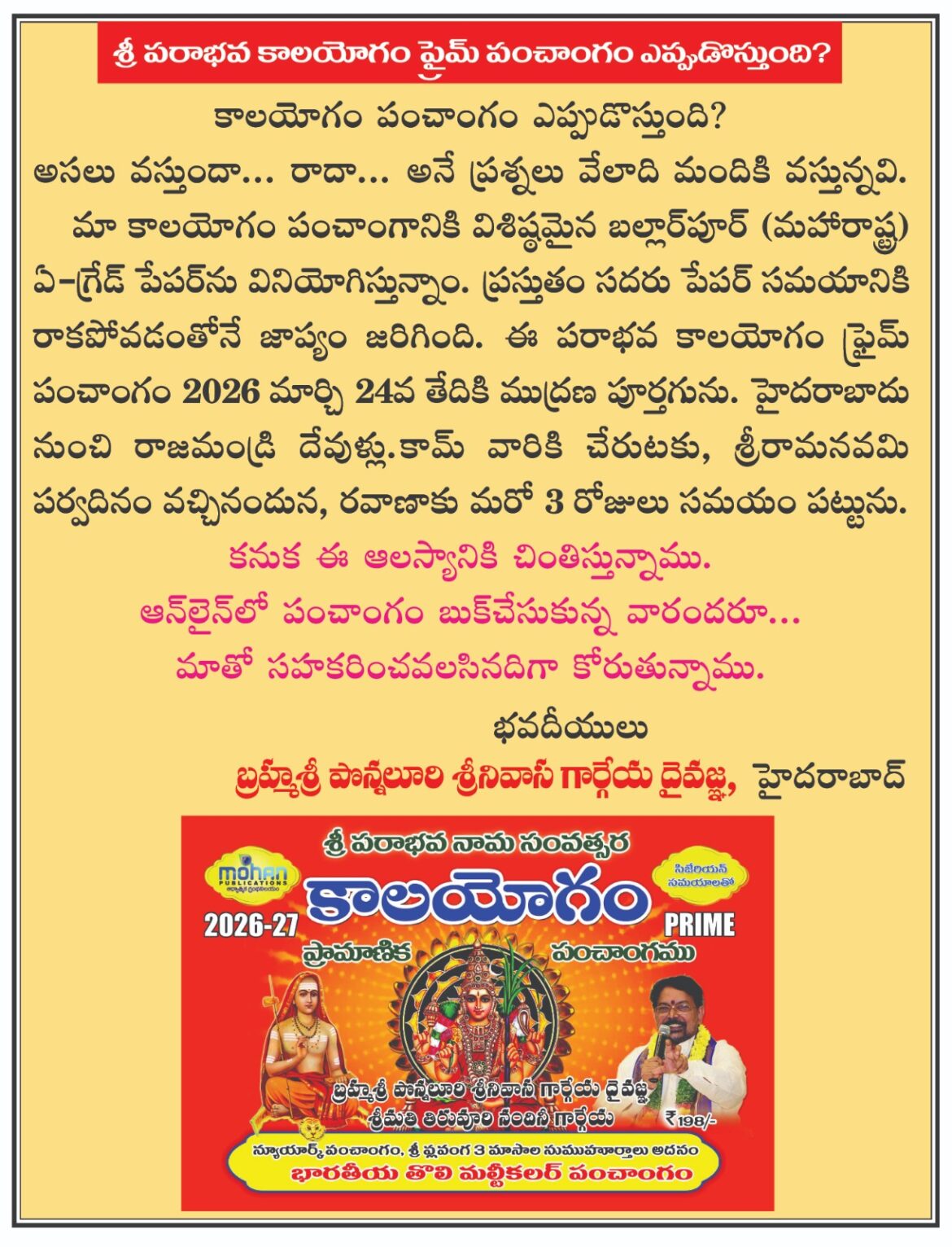 ArticlesAstrologyBlogsLatest శ్రీ పరాభవ కాలయోగం ప్రైమ్ పంచాంగం ఎప్పుడొస్తుంది ? by gargeyaastro March 14, 2026 written by gargeyaastro March 14, 2026 684 0 comment 0 FacebookTwitterPinterestEmail gargeyaastro previous post Panchangam From March 19-23 2026 next post 26 March 2026 You may also like TO ORDER PANCHANGAM 2026-2027 PLEASE CALL TO 83410... April 5, 2026 Panchangam from 2026 APRIL 13-17 April 5, 2026 Panchangam from 2026 APRIL 8-12 April 5, 2026 Panchangam from 2026 APRIL 3-7 April 5, 2026 Panchangam from March 29- April 02 2026 March 29, 2026 Panchangam from march 24-28 2026 March 29, 2026 26 March 2026 March 15, 2026 Panchangam From March 19-23 2026 March 14, 2026 కుజ దోషము సంపూర్ణ వివరణ January 3, 2026 2026 జనవరి, ఫిబ్రవరి ధనస్సు, మకరాలలో చాతుర్గ్రహ కూటములు 12... January 3, 2026 Leave a Comment Cancel Reply Save my name, email, and website in this browser for the next time I comment.