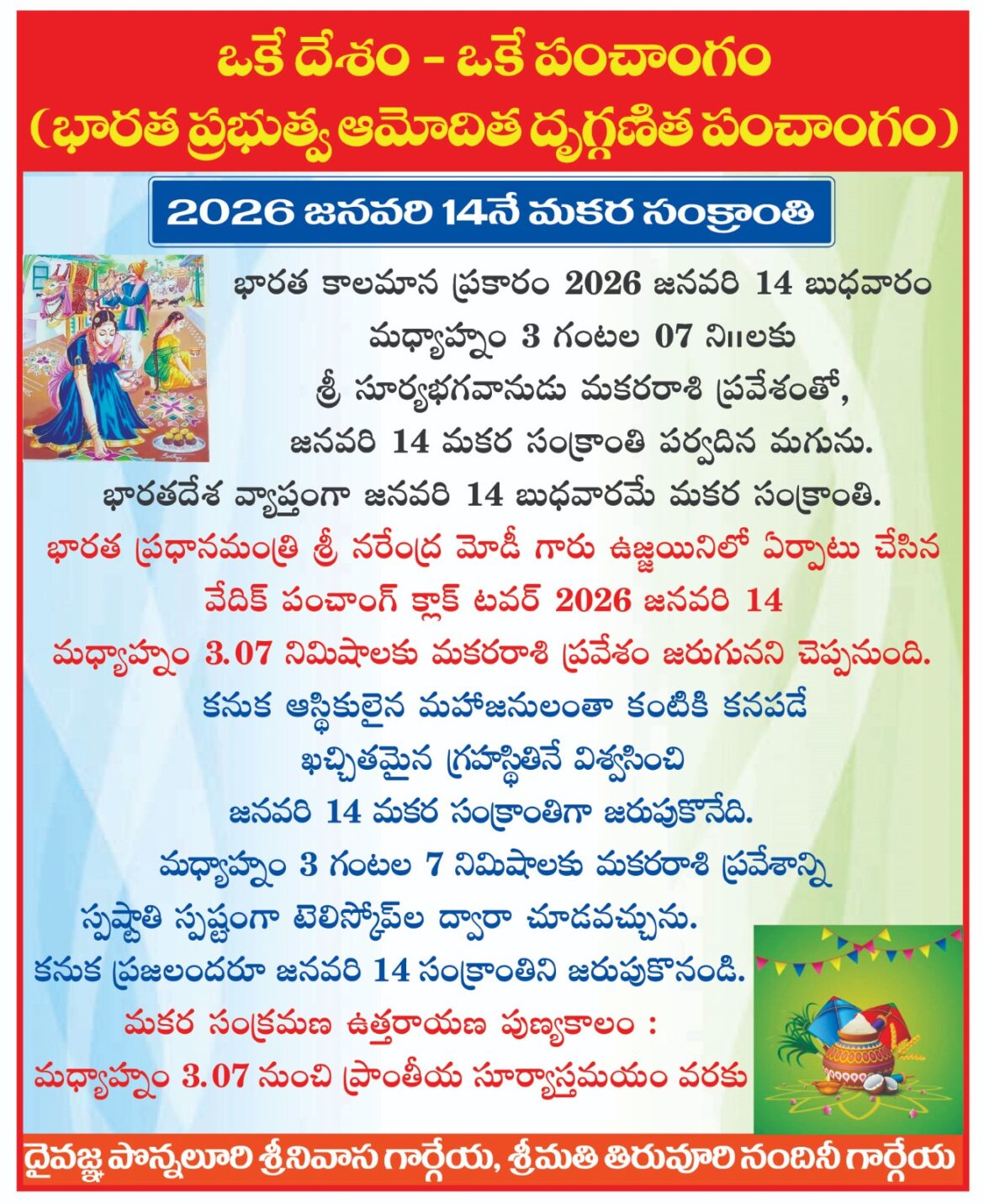 ArticlesAstrologyLatest 2026 JANUARY 14 MAKARA SANKRANTHI by gargeyaastro November 25, 2025 written by gargeyaastro November 25, 2025 131 0 comment 0 FacebookTwitterPinterestEmail gargeyaastro previous post https://whatsapp.com/channel/0029VbBUEwL1Xqudb588MJ1X next post Panchangam from NOV 26-30 You may also like గోదావరి పుష్కరాలకు ఇదే ఖచ్చిత తేదీ December 16, 2025 శ్రీ చంద్రబాబు నాయుడు గారికి ధన్యవాదములు December 16, 2025 ప్రపంచవ్యాప్తంగా 2 ఆగస్టు 2026 నుంచి భవిష్య ఉద్యోగాలకు గండి... December 16, 2025 please call to 83410 32385 విజయవాడ 2026 జనవరి... December 16, 2025 Panchangam From Dec 11-15 2025 December 14, 2025 Panchangam From Dec 6-10 2025 December 6, 2025 ప్రజలను గందరగోళంలోకి నెట్టిన ఆంధ్రప్రదేశ్ ప్రభుత్వ పండుగల లిస్ట్ December 6, 2025 కేంద్ర ప్రభుత్వ సెలవుల క్యాలెండర్ విడుదలైంది December 6, 2025 కేంద్ర ప్రభుత్వ సెలవుల క్యాలెండర్ విడుదలైంది December 6, 2025 పంచాంగాలలో ఇచ్చే ఆదాయ వ్యయ నిర్ణయాలనేవి ఓ గుడ్డి పద్ధతి December 6, 2025 Leave a Comment Cancel Reply Save my name, email, and website in this browser for the next time I comment.