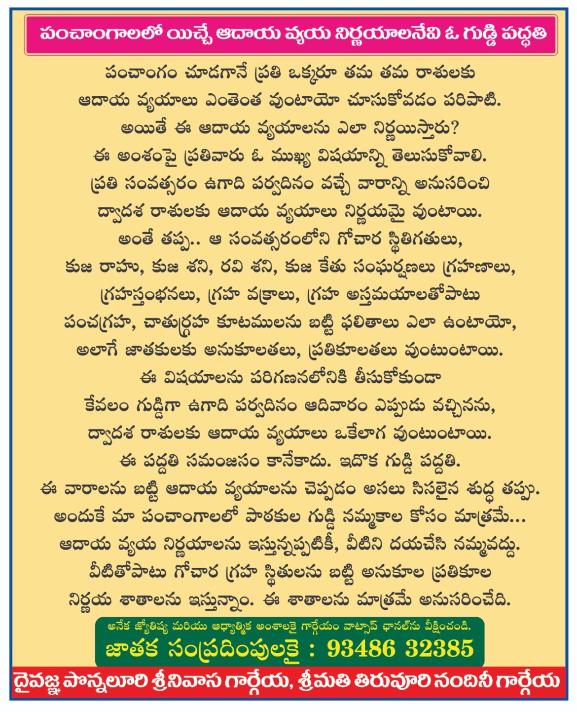 ArticlesAstrologyBlogsLatest పంచాంగాలలో ఇచ్చే ఆదాయ వ్యయ నిర్ణయాలనేవి ఓ గుడ్డి పద్ధతి by gargeyaastro December 6, 2025 written by gargeyaastro December 6, 2025 0 comment 0 FacebookTwitterPinterestEmail