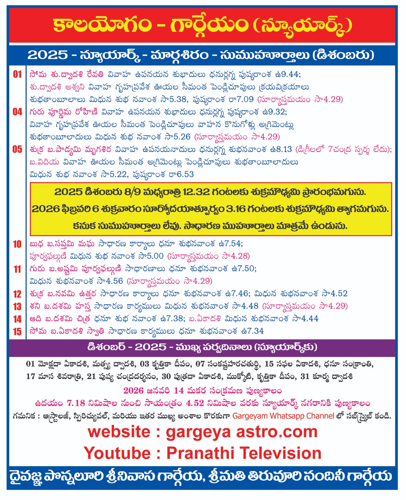 AstrologyLatestNitya Panchangam DEC 2025 Newyork muhurthas by gargeyaastro November 25, 2025 written by gargeyaastro November 25, 2025 310 0 comment 0 FacebookTwitterPinterestEmail gargeyaastro previous post Panchangam from NOV 26-30 next post Godavari Pushkaralu from 26 june to july 7 2027 You may also like Panchangam From Dec 11-15 2025 December 14, 2025 Panchangam From Dec 6-10 2025 December 6, 2025 ప్రజలను గందరగోళంలోకి నెట్టిన ఆంధ్రప్రదేశ్ ప్రభుత్వ పండుగల లిస్ట్ December 6, 2025 కేంద్ర ప్రభుత్వ సెలవుల క్యాలెండర్ విడుదలైంది December 6, 2025 కేంద్ర ప్రభుత్వ సెలవుల క్యాలెండర్ విడుదలైంది December 6, 2025 పంచాంగాలలో ఇచ్చే ఆదాయ వ్యయ నిర్ణయాలనేవి ఓ గుడ్డి పద్ధతి December 6, 2025 గోదావరి పుష్కరాలకు ఇదే ఖచ్చిత తేదీ December 6, 2025 జాతకాలలో వివాహస్థానం- ఫలితాలు – 2 November 30, 2025 Appointments in RAJAHMUNDRY AND VIZAG on DEC 25th... November 30, 2025 2026 ద్వాదశ రాశులకు అనుకూల – ప్రతికూలతులు November 28, 2025 Leave a Comment Cancel Reply Save my name, email, and website in this browser for the next time I comment.