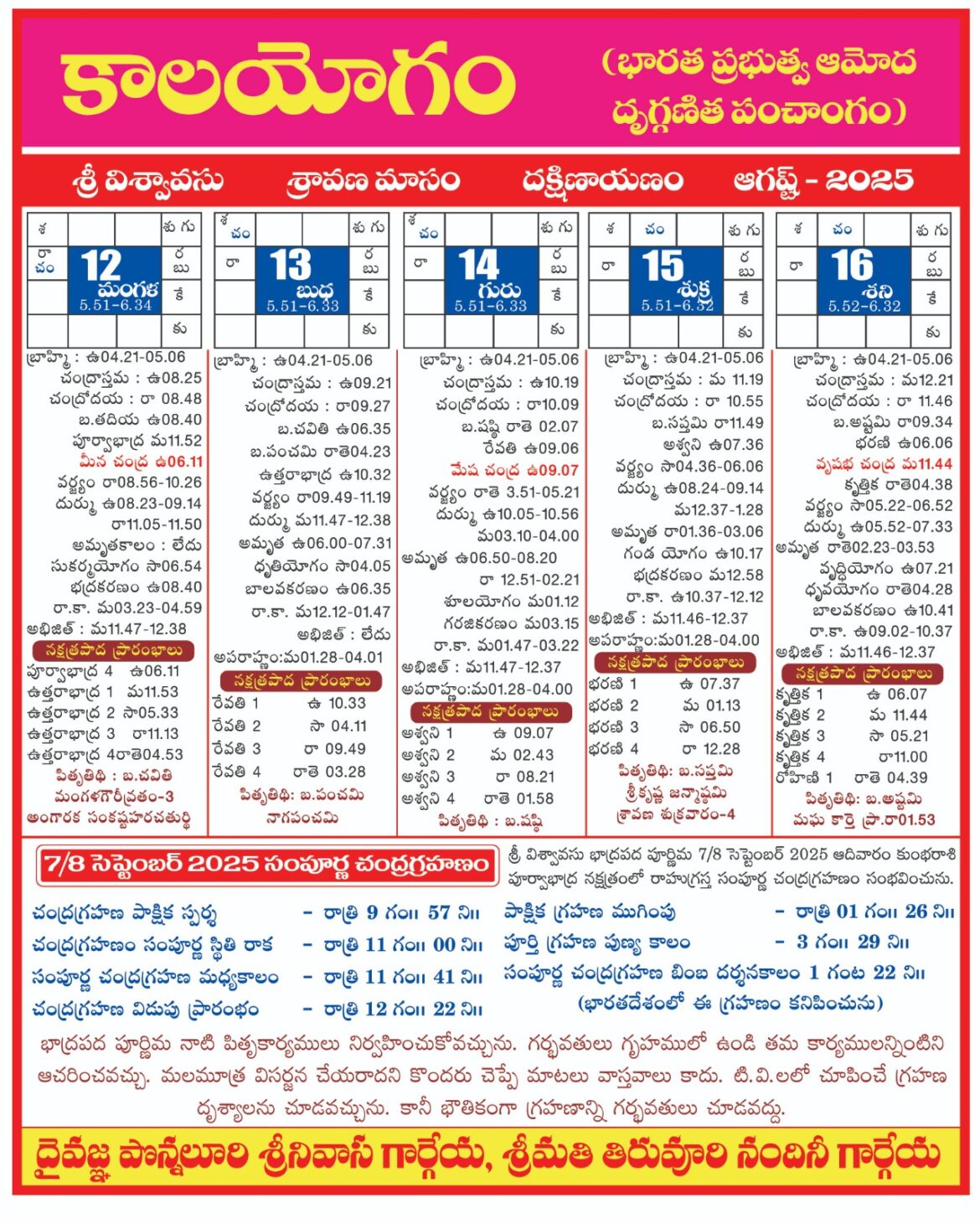 AstrologyLatestNitya Panchangam Panchangam From 12-16 August 2025 by gargeyaastro August 11, 2025 written by gargeyaastro August 11, 2025 707 0 comment 1 FacebookTwitterPinterestEmail gargeyaastro previous post Panchangam on 12 August 2025 next post August 1st 2025 in our peetam in Rajamundry You may also like గోదావరి పుష్కరాలకు ఇదే ఖచ్చిత తేదీ December 16, 2025 శ్రీ చంద్రబాబు నాయుడు గారికి ధన్యవాదములు December 16, 2025 ప్రపంచవ్యాప్తంగా 2 ఆగస్టు 2026 నుంచి భవిష్య ఉద్యోగాలకు గండి... December 16, 2025 please call to 83410 32385 విజయవాడ 2026 జనవరి... December 16, 2025 Panchangam From Dec 11-15 2025 December 14, 2025 Panchangam From Dec 6-10 2025 December 6, 2025 ప్రజలను గందరగోళంలోకి నెట్టిన ఆంధ్రప్రదేశ్ ప్రభుత్వ పండుగల లిస్ట్ December 6, 2025 కేంద్ర ప్రభుత్వ సెలవుల క్యాలెండర్ విడుదలైంది December 6, 2025 కేంద్ర ప్రభుత్వ సెలవుల క్యాలెండర్ విడుదలైంది December 6, 2025 పంచాంగాలలో ఇచ్చే ఆదాయ వ్యయ నిర్ణయాలనేవి ఓ గుడ్డి పద్ధతి December 6, 2025 Leave a Comment Cancel Reply Save my name, email, and website in this browser for the next time I comment.