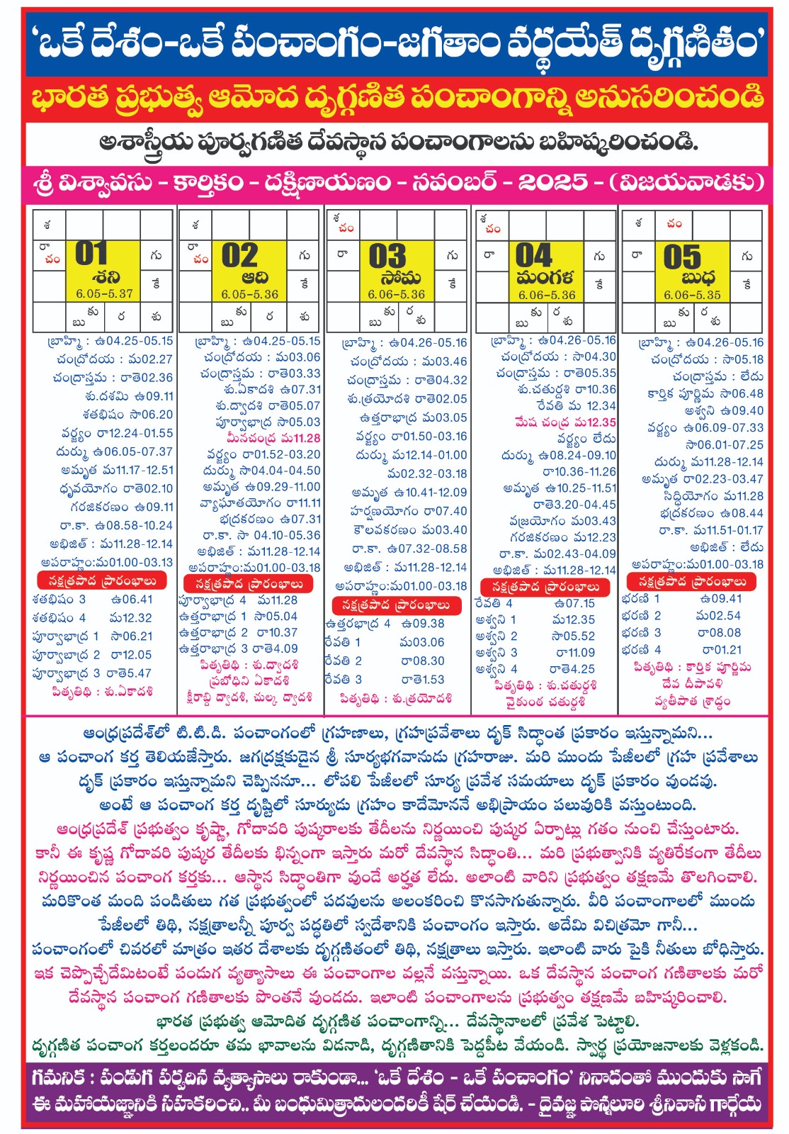 AstrologyLatestNitya Panchangam Panchangam from NOV 1 – 5 by gargeyaastro November 4, 2025 written by gargeyaastro November 4, 2025 280 0 comment 0 FacebookTwitterPinterestEmail gargeyaastro previous post Festival timings for 13,14,15 january 2026 next post Panchangam from NOV 6 – 10 You may also like గోదావరి పుష్కరాలకు ఇదే ఖచ్చిత తేదీ December 16, 2025 శ్రీ చంద్రబాబు నాయుడు గారికి ధన్యవాదములు December 16, 2025 ప్రపంచవ్యాప్తంగా 2 ఆగస్టు 2026 నుంచి భవిష్య ఉద్యోగాలకు గండి... December 16, 2025 please call to 83410 32385 విజయవాడ 2026 జనవరి... December 16, 2025 Panchangam From Dec 11-15 2025 December 14, 2025 Panchangam From Dec 6-10 2025 December 6, 2025 ప్రజలను గందరగోళంలోకి నెట్టిన ఆంధ్రప్రదేశ్ ప్రభుత్వ పండుగల లిస్ట్ December 6, 2025 కేంద్ర ప్రభుత్వ సెలవుల క్యాలెండర్ విడుదలైంది December 6, 2025 కేంద్ర ప్రభుత్వ సెలవుల క్యాలెండర్ విడుదలైంది December 6, 2025 పంచాంగాలలో ఇచ్చే ఆదాయ వ్యయ నిర్ణయాలనేవి ఓ గుడ్డి పద్ధతి December 6, 2025 Leave a Comment Cancel Reply Save my name, email, and website in this browser for the next time I comment.