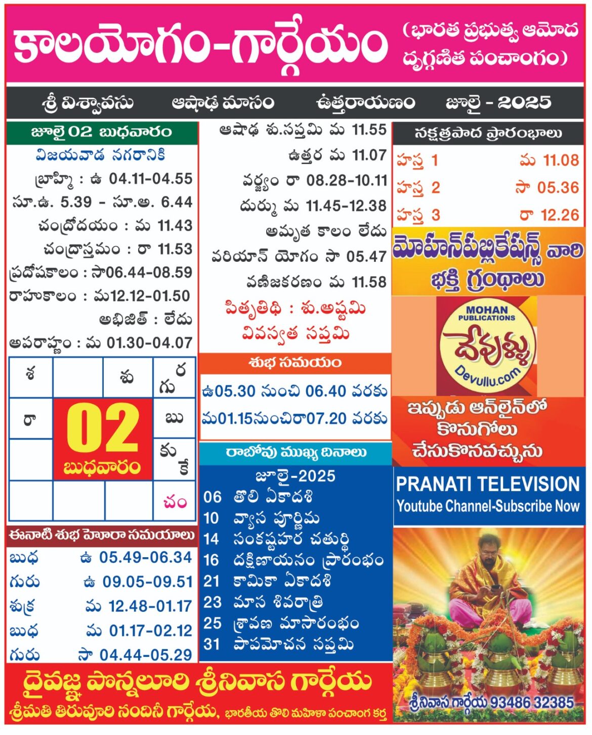 AstrologyLatestNitya Panchangam Panchangam on 02 July 2025 by gargeyaastro June 30, 2025 written by gargeyaastro June 30, 2025 444 0 comment 0 FacebookTwitterPinterestEmail gargeyaastro previous post Panchangam on 01 July 2025 next post Panchangam on 03 July 2025 You may also like గోదావరి పుష్కరాలకు ఇదే ఖచ్చిత తేదీ December 16, 2025 శ్రీ చంద్రబాబు నాయుడు గారికి ధన్యవాదములు December 16, 2025 ప్రపంచవ్యాప్తంగా 2 ఆగస్టు 2026 నుంచి భవిష్య ఉద్యోగాలకు గండి... December 16, 2025 please call to 83410 32385 విజయవాడ 2026 జనవరి... December 16, 2025 Panchangam From Dec 11-15 2025 December 14, 2025 Panchangam From Dec 6-10 2025 December 6, 2025 ప్రజలను గందరగోళంలోకి నెట్టిన ఆంధ్రప్రదేశ్ ప్రభుత్వ పండుగల లిస్ట్ December 6, 2025 కేంద్ర ప్రభుత్వ సెలవుల క్యాలెండర్ విడుదలైంది December 6, 2025 కేంద్ర ప్రభుత్వ సెలవుల క్యాలెండర్ విడుదలైంది December 6, 2025 పంచాంగాలలో ఇచ్చే ఆదాయ వ్యయ నిర్ణయాలనేవి ఓ గుడ్డి పద్ధతి December 6, 2025 Leave a Comment Cancel Reply Save my name, email, and website in this browser for the next time I comment.