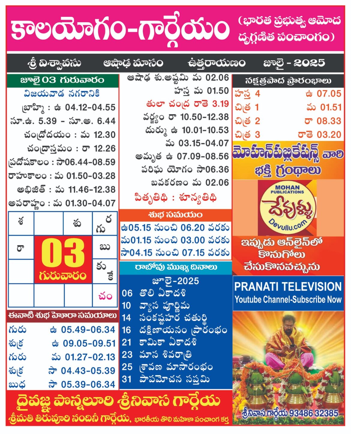 AstrologyLatestNitya Panchangam Panchangam on 03 July 2025 by gargeyaastro June 30, 2025 written by gargeyaastro June 30, 2025 622 0 comment 0 FacebookTwitterPinterestEmail gargeyaastro previous post Panchangam on 02 July 2025 next post Panchangam on 04 July 2025 You may also like గోదావరి పుష్కరాలకు ఇదే ఖచ్చిత తేదీ December 16, 2025 శ్రీ చంద్రబాబు నాయుడు గారికి ధన్యవాదములు December 16, 2025 ప్రపంచవ్యాప్తంగా 2 ఆగస్టు 2026 నుంచి భవిష్య ఉద్యోగాలకు గండి... December 16, 2025 please call to 83410 32385 విజయవాడ 2026 జనవరి... December 16, 2025 Panchangam From Dec 11-15 2025 December 14, 2025 Panchangam From Dec 6-10 2025 December 6, 2025 ప్రజలను గందరగోళంలోకి నెట్టిన ఆంధ్రప్రదేశ్ ప్రభుత్వ పండుగల లిస్ట్ December 6, 2025 కేంద్ర ప్రభుత్వ సెలవుల క్యాలెండర్ విడుదలైంది December 6, 2025 కేంద్ర ప్రభుత్వ సెలవుల క్యాలెండర్ విడుదలైంది December 6, 2025 పంచాంగాలలో ఇచ్చే ఆదాయ వ్యయ నిర్ణయాలనేవి ఓ గుడ్డి పద్ధతి December 6, 2025 Leave a Comment Cancel Reply Save my name, email, and website in this browser for the next time I comment.