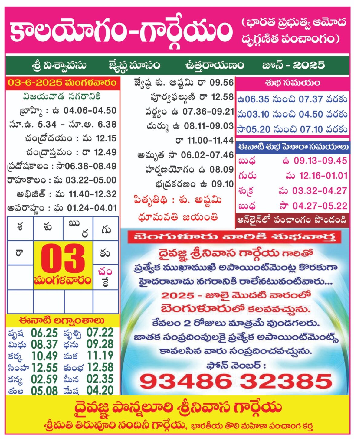 AstrologyLatestNitya Panchangam Panchangam on 03 June 2025 by gargeyaastro June 6, 2025 written by gargeyaastro June 6, 2025 125 0 comment 0 FacebookTwitterPinterestEmail gargeyaastro previous post GOOD NEWS FOR BANGLORE PEOPLE next post Panchangam on 04 June 2025 You may also like గోదావరి పుష్కరాలకు ఇదే ఖచ్చిత తేదీ December 16, 2025 శ్రీ చంద్రబాబు నాయుడు గారికి ధన్యవాదములు December 16, 2025 ప్రపంచవ్యాప్తంగా 2 ఆగస్టు 2026 నుంచి భవిష్య ఉద్యోగాలకు గండి... December 16, 2025 please call to 83410 32385 విజయవాడ 2026 జనవరి... December 16, 2025 Panchangam From Dec 11-15 2025 December 14, 2025 Panchangam From Dec 6-10 2025 December 6, 2025 ప్రజలను గందరగోళంలోకి నెట్టిన ఆంధ్రప్రదేశ్ ప్రభుత్వ పండుగల లిస్ట్ December 6, 2025 కేంద్ర ప్రభుత్వ సెలవుల క్యాలెండర్ విడుదలైంది December 6, 2025 కేంద్ర ప్రభుత్వ సెలవుల క్యాలెండర్ విడుదలైంది December 6, 2025 పంచాంగాలలో ఇచ్చే ఆదాయ వ్యయ నిర్ణయాలనేవి ఓ గుడ్డి పద్ధతి December 6, 2025 Leave a Comment Cancel Reply Save my name, email, and website in this browser for the next time I comment.
