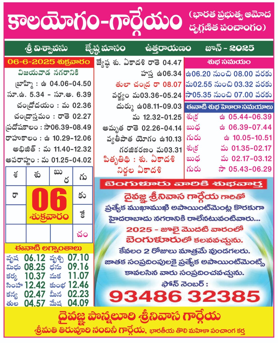 AstrologyLatestNitya Panchangam Panchangam on 06 June 2025 by gargeyaastro June 6, 2025 written by gargeyaastro June 6, 2025 182 0 comment 0 FacebookTwitterPinterestEmail gargeyaastro previous post Panchangam on 05 June 2025 next post Panchangam on 07 June 2025 You may also like గోదావరి పుష్కరాలకు ఇదే ఖచ్చిత తేదీ December 16, 2025 శ్రీ చంద్రబాబు నాయుడు గారికి ధన్యవాదములు December 16, 2025 ప్రపంచవ్యాప్తంగా 2 ఆగస్టు 2026 నుంచి భవిష్య ఉద్యోగాలకు గండి... December 16, 2025 please call to 83410 32385 విజయవాడ 2026 జనవరి... December 16, 2025 Panchangam From Dec 11-15 2025 December 14, 2025 Panchangam From Dec 6-10 2025 December 6, 2025 ప్రజలను గందరగోళంలోకి నెట్టిన ఆంధ్రప్రదేశ్ ప్రభుత్వ పండుగల లిస్ట్ December 6, 2025 కేంద్ర ప్రభుత్వ సెలవుల క్యాలెండర్ విడుదలైంది December 6, 2025 కేంద్ర ప్రభుత్వ సెలవుల క్యాలెండర్ విడుదలైంది December 6, 2025 పంచాంగాలలో ఇచ్చే ఆదాయ వ్యయ నిర్ణయాలనేవి ఓ గుడ్డి పద్ధతి December 6, 2025 Leave a Comment Cancel Reply Save my name, email, and website in this browser for the next time I comment.