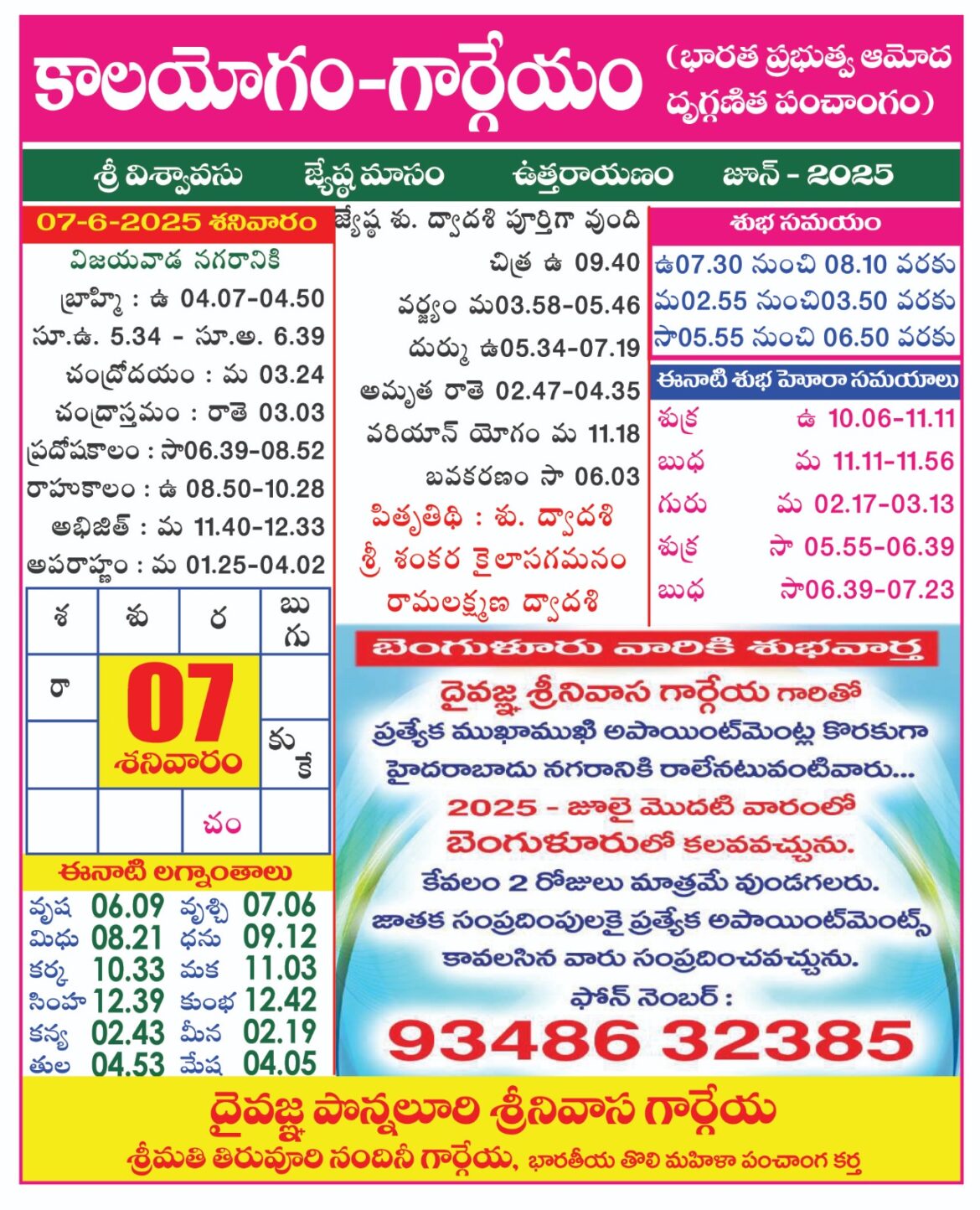 AstrologyLatestNitya Panchangam Panchangam on 07 June 2025 by gargeyaastro June 6, 2025 written by gargeyaastro June 6, 2025 224 0 comment 0 FacebookTwitterPinterestEmail gargeyaastro previous post Panchangam on 06 June 2025 next post Panchangam on 08 June 2025 You may also like గోదావరి పుష్కరాలకు ఇదే ఖచ్చిత తేదీ December 16, 2025 శ్రీ చంద్రబాబు నాయుడు గారికి ధన్యవాదములు December 16, 2025 ప్రపంచవ్యాప్తంగా 2 ఆగస్టు 2026 నుంచి భవిష్య ఉద్యోగాలకు గండి... December 16, 2025 please call to 83410 32385 విజయవాడ 2026 జనవరి... December 16, 2025 Panchangam From Dec 11-15 2025 December 14, 2025 Panchangam From Dec 6-10 2025 December 6, 2025 ప్రజలను గందరగోళంలోకి నెట్టిన ఆంధ్రప్రదేశ్ ప్రభుత్వ పండుగల లిస్ట్ December 6, 2025 కేంద్ర ప్రభుత్వ సెలవుల క్యాలెండర్ విడుదలైంది December 6, 2025 కేంద్ర ప్రభుత్వ సెలవుల క్యాలెండర్ విడుదలైంది December 6, 2025 పంచాంగాలలో ఇచ్చే ఆదాయ వ్యయ నిర్ణయాలనేవి ఓ గుడ్డి పద్ధతి December 6, 2025 Leave a Comment Cancel Reply Save my name, email, and website in this browser for the next time I comment.
