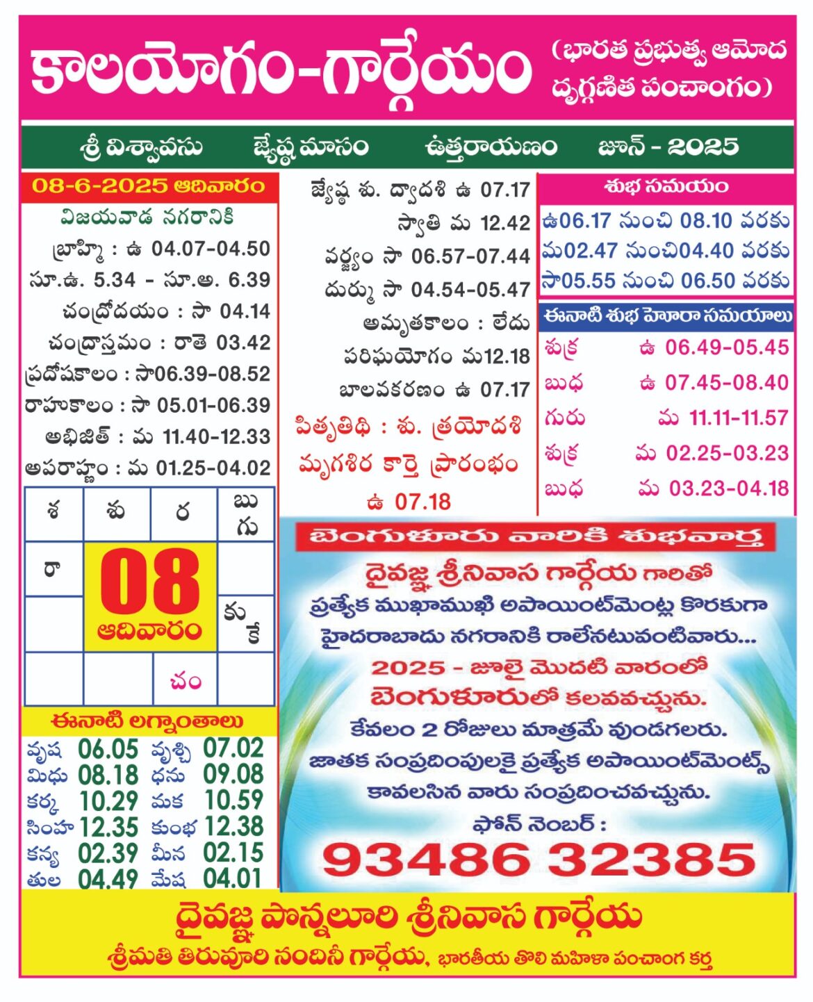 AstrologyLatestNitya Panchangam Panchangam on 08 June 2025 by gargeyaastro June 6, 2025 written by gargeyaastro June 6, 2025 345 0 comment 0 FacebookTwitterPinterestEmail gargeyaastro previous post Panchangam on 07 June 2025 next post Panchangam on 09 June 2025 You may also like గోదావరి పుష్కరాలకు ఇదే ఖచ్చిత తేదీ December 16, 2025 శ్రీ చంద్రబాబు నాయుడు గారికి ధన్యవాదములు December 16, 2025 ప్రపంచవ్యాప్తంగా 2 ఆగస్టు 2026 నుంచి భవిష్య ఉద్యోగాలకు గండి... December 16, 2025 please call to 83410 32385 విజయవాడ 2026 జనవరి... December 16, 2025 Panchangam From Dec 11-15 2025 December 14, 2025 Panchangam From Dec 6-10 2025 December 6, 2025 ప్రజలను గందరగోళంలోకి నెట్టిన ఆంధ్రప్రదేశ్ ప్రభుత్వ పండుగల లిస్ట్ December 6, 2025 కేంద్ర ప్రభుత్వ సెలవుల క్యాలెండర్ విడుదలైంది December 6, 2025 కేంద్ర ప్రభుత్వ సెలవుల క్యాలెండర్ విడుదలైంది December 6, 2025 పంచాంగాలలో ఇచ్చే ఆదాయ వ్యయ నిర్ణయాలనేవి ఓ గుడ్డి పద్ధతి December 6, 2025 Leave a Comment Cancel Reply Save my name, email, and website in this browser for the next time I comment.