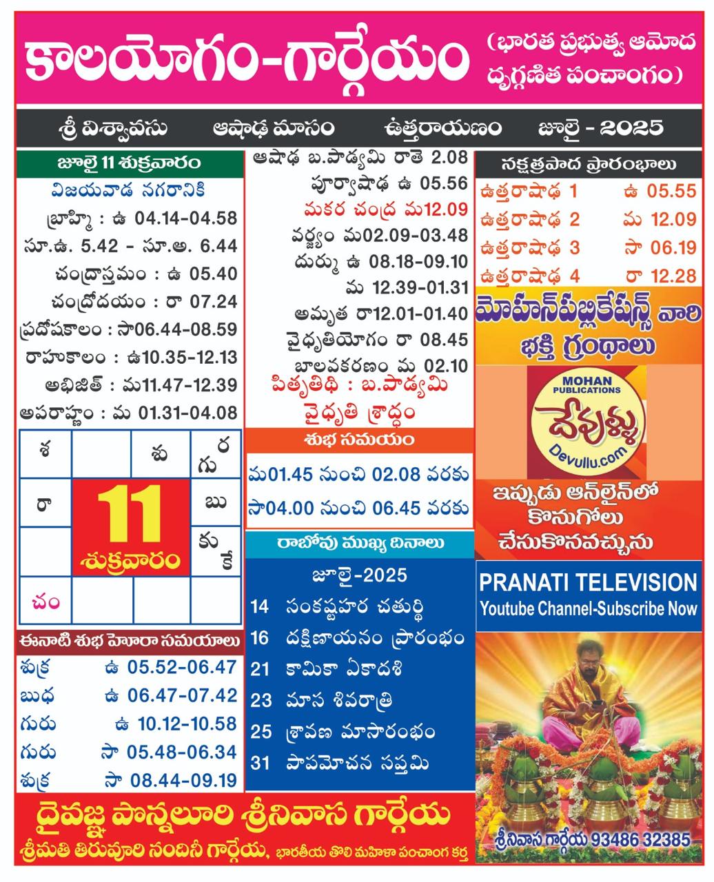 AstrologyLatestNitya Panchangam Panchangam on 11 July 2025 by gargeyaastro July 23, 2025 written by gargeyaastro July 23, 2025 120 0 comment 0 FacebookTwitterPinterestEmail gargeyaastro previous post Panchangam on 10 July 2025 next post Panchangam on 15 July 2025 You may also like Pooja timings for 18,20,21 october 2025 October 16, 2025 DIWALI which day in 2025 ? October 13, 2025 Panchangam from 11-15 0ct 2025 October 13, 2025 panchangam from 6-10 2025 October 3, 2025 2 october 2025 Dasara timings for all states September 30, 2025 For Appointments please contact 8341032385 September 30, 2025 Panchangam from 1-5 october 2025 September 30, 2025 For Appointments please contact 8341032385 September 23, 2025 For Appointments please contact 8341032385 September 23, 2025 2025-2033 these 8 years changes in the world September 23, 2025 Leave a Comment Cancel Reply Save my name, email, and website in this browser for the next time I comment.