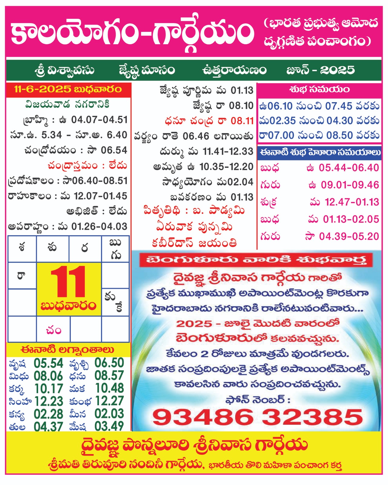 AstrologyLatestNitya Panchangam Panchangam on 11 June 2025 by gargeyaastro June 10, 2025 written by gargeyaastro June 10, 2025 308 0 comment 0 FacebookTwitterPinterestEmail gargeyaastro previous post Panchangam on 10 June 2025 next post Panchangam on 12 June 2025 You may also like Pooja timings for 18,20,21 october 2025 October 16, 2025 DIWALI which day in 2025 ? October 13, 2025 Panchangam from 11-15 0ct 2025 October 13, 2025 panchangam from 6-10 2025 October 3, 2025 2 october 2025 Dasara timings for all states September 30, 2025 For Appointments please contact 8341032385 September 30, 2025 Panchangam from 1-5 october 2025 September 30, 2025 For Appointments please contact 8341032385 September 23, 2025 For Appointments please contact 8341032385 September 23, 2025 2025-2033 these 8 years changes in the world September 23, 2025 Leave a Comment Cancel Reply Save my name, email, and website in this browser for the next time I comment.