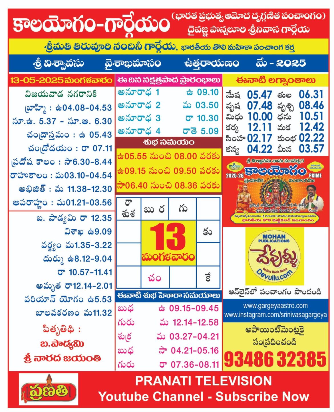 BlogsLatestNitya Panchangam Panchangam on 13 MAY 2025 by gargeyaastro May 9, 2025 written by gargeyaastro May 9, 2025 295 0 comment 0 FacebookTwitterPinterestEmail gargeyaastro previous post Panchangam on 12 MAY 2025 next post Panchangam on 14 MAY 2025 You may also like గోదావరి పుష్కరాలకు ఇదే ఖచ్చిత తేదీ December 16, 2025 శ్రీ చంద్రబాబు నాయుడు గారికి ధన్యవాదములు December 16, 2025 ప్రపంచవ్యాప్తంగా 2 ఆగస్టు 2026 నుంచి భవిష్య ఉద్యోగాలకు గండి... December 16, 2025 please call to 83410 32385 విజయవాడ 2026 జనవరి... December 16, 2025 Panchangam From Dec 11-15 2025 December 14, 2025 Panchangam From Dec 6-10 2025 December 6, 2025 ప్రజలను గందరగోళంలోకి నెట్టిన ఆంధ్రప్రదేశ్ ప్రభుత్వ పండుగల లిస్ట్ December 6, 2025 కేంద్ర ప్రభుత్వ సెలవుల క్యాలెండర్ విడుదలైంది December 6, 2025 కేంద్ర ప్రభుత్వ సెలవుల క్యాలెండర్ విడుదలైంది December 6, 2025 పంచాంగాలలో ఇచ్చే ఆదాయ వ్యయ నిర్ణయాలనేవి ఓ గుడ్డి పద్ధతి December 6, 2025 Leave a Comment Cancel Reply Save my name, email, and website in this browser for the next time I comment.