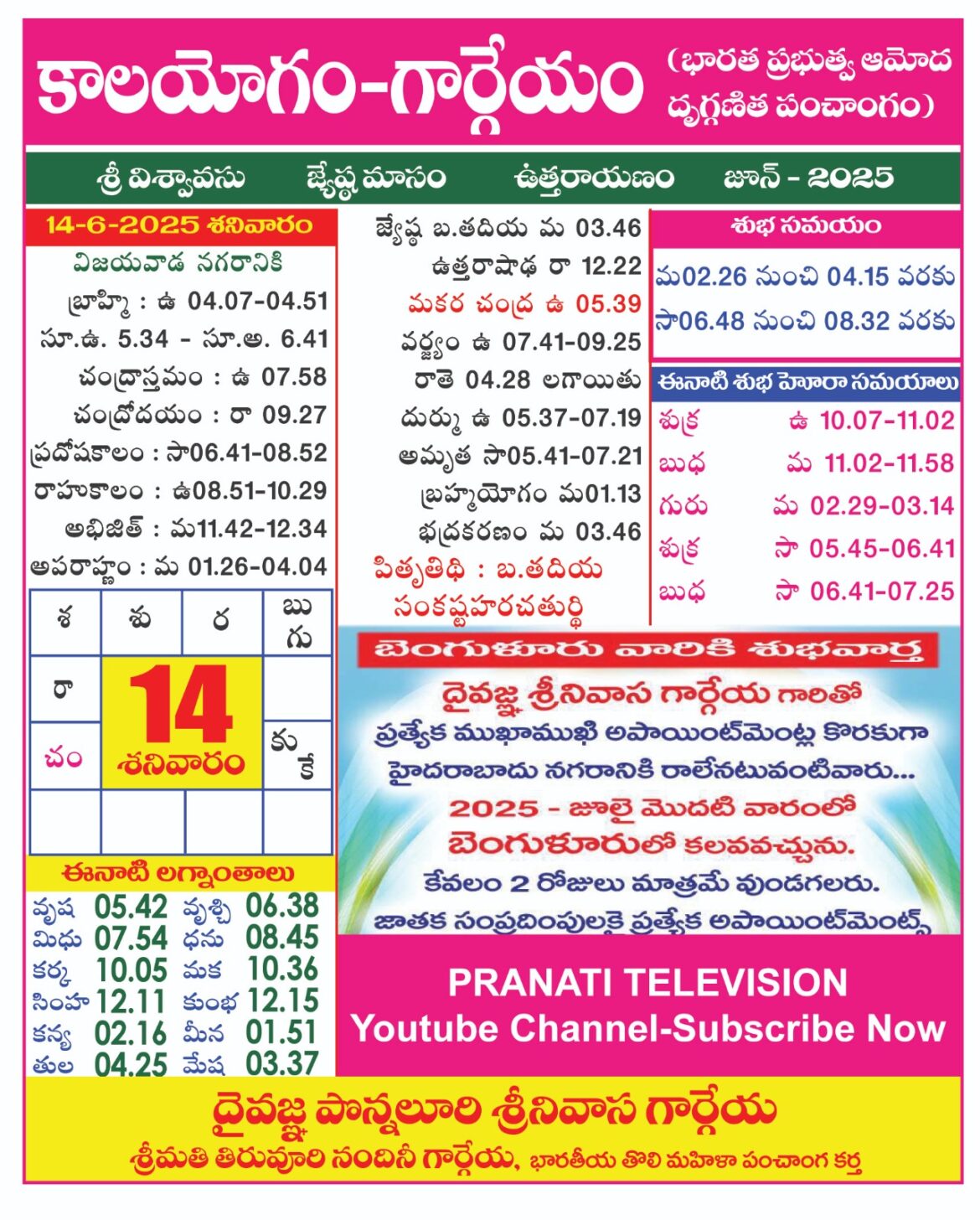 AstrologyLatestNitya Panchangam Panchangam on 14 June 2025 by gargeyaastro June 14, 2025 written by gargeyaastro June 14, 2025 255 0 comment 0 FacebookTwitterPinterestEmail gargeyaastro previous post Panchangam on 13 June 2025 next post Panchangam on 15 June 2025 You may also like గోదావరి పుష్కరాలకు ఇదే ఖచ్చిత తేదీ December 16, 2025 శ్రీ చంద్రబాబు నాయుడు గారికి ధన్యవాదములు December 16, 2025 ప్రపంచవ్యాప్తంగా 2 ఆగస్టు 2026 నుంచి భవిష్య ఉద్యోగాలకు గండి... December 16, 2025 please call to 83410 32385 విజయవాడ 2026 జనవరి... December 16, 2025 Panchangam From Dec 11-15 2025 December 14, 2025 Panchangam From Dec 6-10 2025 December 6, 2025 ప్రజలను గందరగోళంలోకి నెట్టిన ఆంధ్రప్రదేశ్ ప్రభుత్వ పండుగల లిస్ట్ December 6, 2025 కేంద్ర ప్రభుత్వ సెలవుల క్యాలెండర్ విడుదలైంది December 6, 2025 కేంద్ర ప్రభుత్వ సెలవుల క్యాలెండర్ విడుదలైంది December 6, 2025 పంచాంగాలలో ఇచ్చే ఆదాయ వ్యయ నిర్ణయాలనేవి ఓ గుడ్డి పద్ధతి December 6, 2025 Leave a Comment Cancel Reply Save my name, email, and website in this browser for the next time I comment.