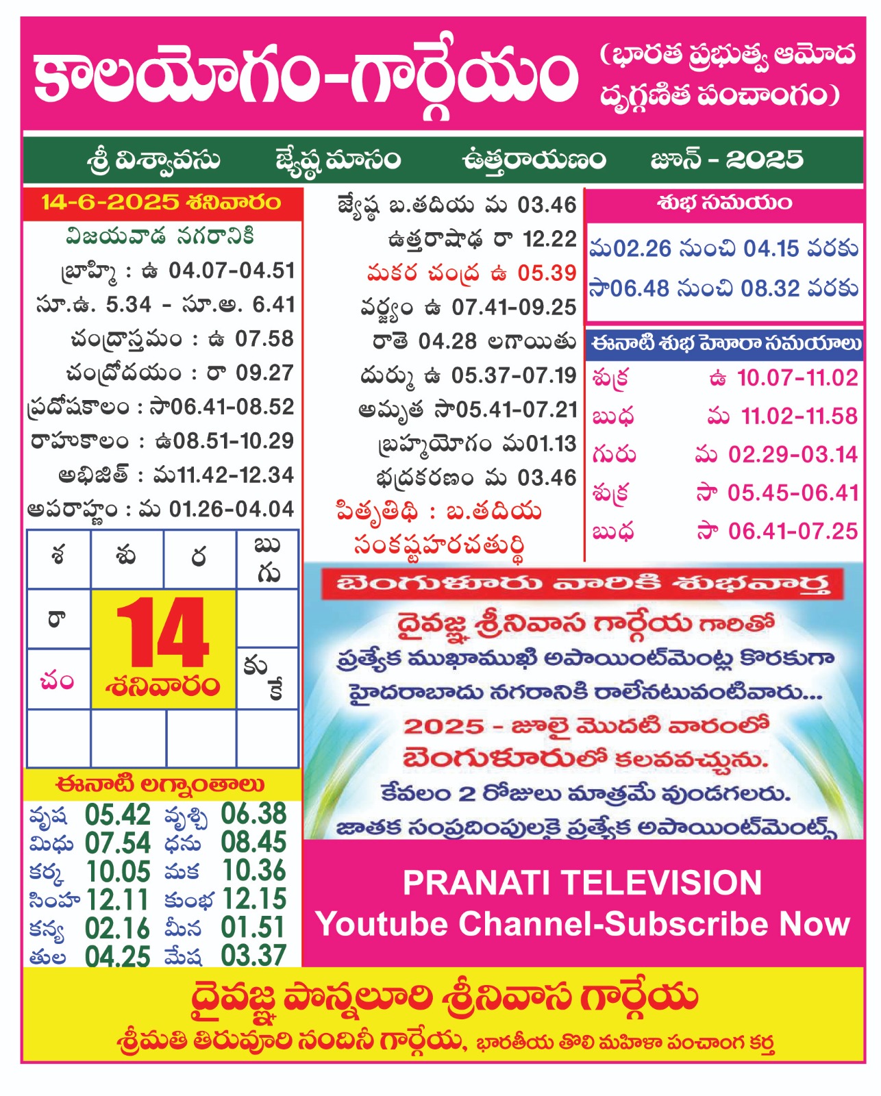 AstrologyLatestNitya Panchangam Panchangam on 14 June 2025 by gargeyaastro June 14, 2025 written by gargeyaastro June 14, 2025 201 0 comment 0 FacebookTwitterPinterestEmail gargeyaastro previous post Panchangam on 13 June 2025 next post Panchangam on 15 June 2025 You may also like Pooja timings for 18,20,21 october 2025 October 16, 2025 DIWALI which day in 2025 ? October 13, 2025 Panchangam from 11-15 0ct 2025 October 13, 2025 panchangam from 6-10 2025 October 3, 2025 2 october 2025 Dasara timings for all states September 30, 2025 For Appointments please contact 8341032385 September 30, 2025 Panchangam from 1-5 october 2025 September 30, 2025 For Appointments please contact 8341032385 September 23, 2025 For Appointments please contact 8341032385 September 23, 2025 2025-2033 these 8 years changes in the world September 23, 2025 Leave a Comment Cancel Reply Save my name, email, and website in this browser for the next time I comment.