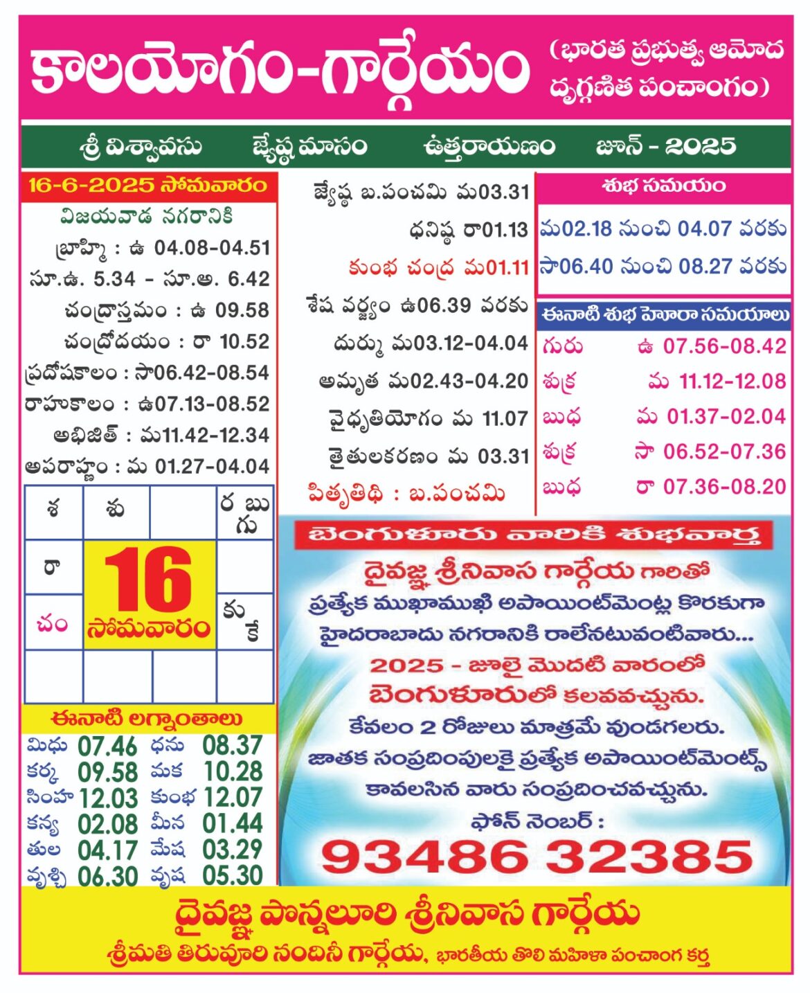 AstrologyLatestNitya Panchangam Panchangam on 16 June 2025 by gargeyaastro June 14, 2025 written by gargeyaastro June 14, 2025 299 0 comment 0 FacebookTwitterPinterestEmail gargeyaastro previous post Panchangam on 15 June 2025 next post Panchangam on 17 June 2025 You may also like గోదావరి పుష్కరాలకు ఇదే ఖచ్చిత తేదీ December 16, 2025 శ్రీ చంద్రబాబు నాయుడు గారికి ధన్యవాదములు December 16, 2025 ప్రపంచవ్యాప్తంగా 2 ఆగస్టు 2026 నుంచి భవిష్య ఉద్యోగాలకు గండి... December 16, 2025 please call to 83410 32385 విజయవాడ 2026 జనవరి... December 16, 2025 Panchangam From Dec 11-15 2025 December 14, 2025 Panchangam From Dec 6-10 2025 December 6, 2025 ప్రజలను గందరగోళంలోకి నెట్టిన ఆంధ్రప్రదేశ్ ప్రభుత్వ పండుగల లిస్ట్ December 6, 2025 కేంద్ర ప్రభుత్వ సెలవుల క్యాలెండర్ విడుదలైంది December 6, 2025 కేంద్ర ప్రభుత్వ సెలవుల క్యాలెండర్ విడుదలైంది December 6, 2025 పంచాంగాలలో ఇచ్చే ఆదాయ వ్యయ నిర్ణయాలనేవి ఓ గుడ్డి పద్ధతి December 6, 2025 Leave a Comment Cancel Reply Save my name, email, and website in this browser for the next time I comment.