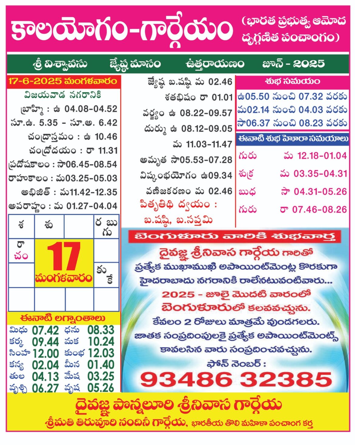 AstrologyLatestNitya Panchangam Panchangam on 17 June 2025 by gargeyaastro June 14, 2025 written by gargeyaastro June 14, 2025 361 0 comment 0 FacebookTwitterPinterestEmail gargeyaastro previous post Panchangam on 16 June 2025 next post గోదావరి పుష్కరాలకు ఇదే ఖచ్చిత తేదీ You may also like గోదావరి పుష్కరాలకు ఇదే ఖచ్చిత తేదీ December 16, 2025 శ్రీ చంద్రబాబు నాయుడు గారికి ధన్యవాదములు December 16, 2025 ప్రపంచవ్యాప్తంగా 2 ఆగస్టు 2026 నుంచి భవిష్య ఉద్యోగాలకు గండి... December 16, 2025 please call to 83410 32385 విజయవాడ 2026 జనవరి... December 16, 2025 Panchangam From Dec 11-15 2025 December 14, 2025 Panchangam From Dec 6-10 2025 December 6, 2025 ప్రజలను గందరగోళంలోకి నెట్టిన ఆంధ్రప్రదేశ్ ప్రభుత్వ పండుగల లిస్ట్ December 6, 2025 కేంద్ర ప్రభుత్వ సెలవుల క్యాలెండర్ విడుదలైంది December 6, 2025 కేంద్ర ప్రభుత్వ సెలవుల క్యాలెండర్ విడుదలైంది December 6, 2025 పంచాంగాలలో ఇచ్చే ఆదాయ వ్యయ నిర్ణయాలనేవి ఓ గుడ్డి పద్ధతి December 6, 2025 Leave a Comment Cancel Reply Save my name, email, and website in this browser for the next time I comment.
