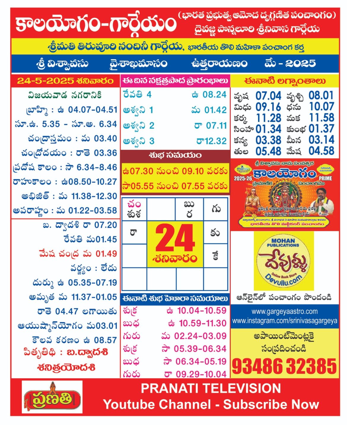 AstrologyLatestNitya Panchangam Panchangam on 24 MAY 2025 by gargeyaastro May 22, 2025 written by gargeyaastro May 22, 2025 249 0 comment 0 FacebookTwitterPinterestEmail gargeyaastro previous post Panchangam on 23 MAY 2025 next post Panchangam on 25 MAY 2025 You may also like గోదావరి పుష్కరాలకు ఇదే ఖచ్చిత తేదీ December 16, 2025 శ్రీ చంద్రబాబు నాయుడు గారికి ధన్యవాదములు December 16, 2025 ప్రపంచవ్యాప్తంగా 2 ఆగస్టు 2026 నుంచి భవిష్య ఉద్యోగాలకు గండి... December 16, 2025 please call to 83410 32385 విజయవాడ 2026 జనవరి... December 16, 2025 Panchangam From Dec 11-15 2025 December 14, 2025 Panchangam From Dec 6-10 2025 December 6, 2025 ప్రజలను గందరగోళంలోకి నెట్టిన ఆంధ్రప్రదేశ్ ప్రభుత్వ పండుగల లిస్ట్ December 6, 2025 కేంద్ర ప్రభుత్వ సెలవుల క్యాలెండర్ విడుదలైంది December 6, 2025 కేంద్ర ప్రభుత్వ సెలవుల క్యాలెండర్ విడుదలైంది December 6, 2025 పంచాంగాలలో ఇచ్చే ఆదాయ వ్యయ నిర్ణయాలనేవి ఓ గుడ్డి పద్ధతి December 6, 2025 Leave a Comment Cancel Reply Save my name, email, and website in this browser for the next time I comment.