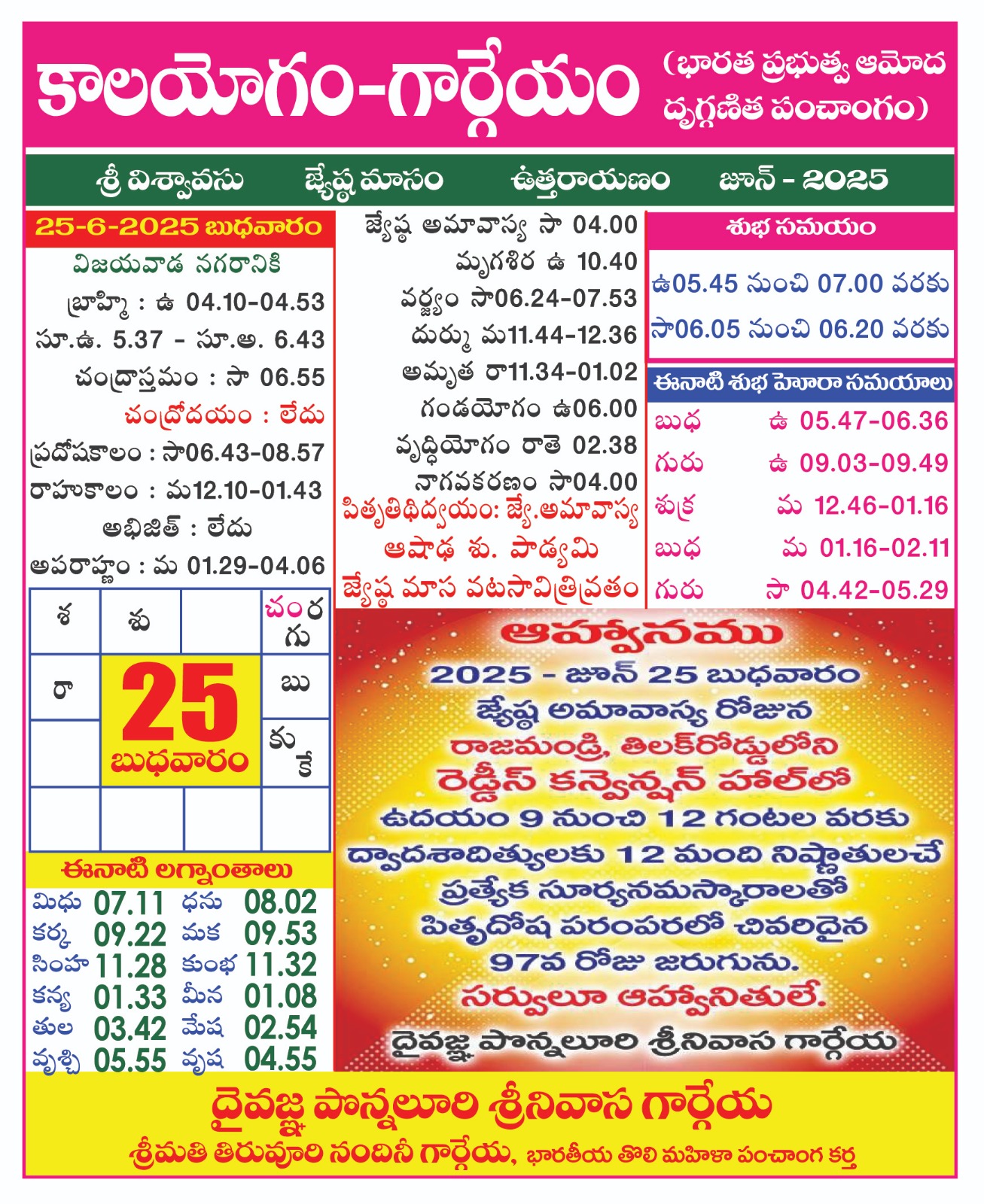 AstrologyLatestNitya Panchangam Panchangam on 25 June 2025 by gargeyaastro June 30, 2025 written by gargeyaastro June 30, 2025 228 0 comment 0 FacebookTwitterPinterestEmail gargeyaastro previous post Panchangam on 24 June 2025 next post Panchangam on 01 July 2025 You may also like Pooja timings for 18,20,21 october 2025 October 16, 2025 DIWALI which day in 2025 ? October 13, 2025 Panchangam from 11-15 0ct 2025 October 13, 2025 panchangam from 6-10 2025 October 3, 2025 2 october 2025 Dasara timings for all states September 30, 2025 For Appointments please contact 8341032385 September 30, 2025 Panchangam from 1-5 october 2025 September 30, 2025 For Appointments please contact 8341032385 September 23, 2025 For Appointments please contact 8341032385 September 23, 2025 2025-2033 these 8 years changes in the world September 23, 2025 Leave a Comment Cancel Reply Save my name, email, and website in this browser for the next time I comment.