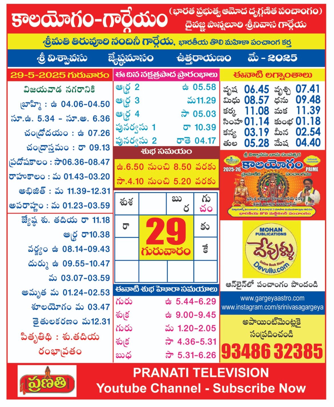AstrologyLatestNitya Panchangam Panchangam on 29 MAY 2025 by gargeyaastro May 28, 2025 written by gargeyaastro May 28, 2025 180 0 comment 0 FacebookTwitterPinterestEmail gargeyaastro previous post Panchangam on 28 MAY 2025 next post Panchangam on 30 MAY 2025 You may also like గోదావరి పుష్కరాలకు ఇదే ఖచ్చిత తేదీ December 16, 2025 శ్రీ చంద్రబాబు నాయుడు గారికి ధన్యవాదములు December 16, 2025 ప్రపంచవ్యాప్తంగా 2 ఆగస్టు 2026 నుంచి భవిష్య ఉద్యోగాలకు గండి... December 16, 2025 please call to 83410 32385 విజయవాడ 2026 జనవరి... December 16, 2025 Panchangam From Dec 11-15 2025 December 14, 2025 Panchangam From Dec 6-10 2025 December 6, 2025 ప్రజలను గందరగోళంలోకి నెట్టిన ఆంధ్రప్రదేశ్ ప్రభుత్వ పండుగల లిస్ట్ December 6, 2025 కేంద్ర ప్రభుత్వ సెలవుల క్యాలెండర్ విడుదలైంది December 6, 2025 కేంద్ర ప్రభుత్వ సెలవుల క్యాలెండర్ విడుదలైంది December 6, 2025 పంచాంగాలలో ఇచ్చే ఆదాయ వ్యయ నిర్ణయాలనేవి ఓ గుడ్డి పద్ధతి December 6, 2025 Leave a Comment Cancel Reply Save my name, email, and website in this browser for the next time I comment.