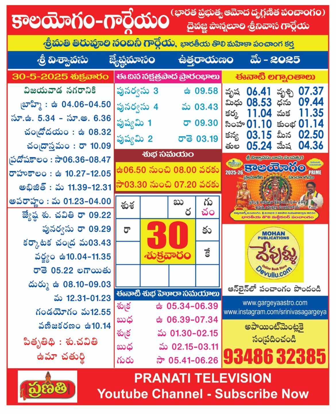 AstrologyLatestNitya Panchangam Panchangam on 30 MAY 2025 by gargeyaastro May 28, 2025 written by gargeyaastro May 28, 2025 347 0 comment 0 FacebookTwitterPinterestEmail gargeyaastro previous post Panchangam on 29 MAY 2025 next post Panchangam on 31 MAY 2025 You may also like గోదావరి పుష్కరాలకు ఇదే ఖచ్చిత తేదీ December 16, 2025 శ్రీ చంద్రబాబు నాయుడు గారికి ధన్యవాదములు December 16, 2025 ప్రపంచవ్యాప్తంగా 2 ఆగస్టు 2026 నుంచి భవిష్య ఉద్యోగాలకు గండి... December 16, 2025 please call to 83410 32385 విజయవాడ 2026 జనవరి... December 16, 2025 Panchangam From Dec 11-15 2025 December 14, 2025 Panchangam From Dec 6-10 2025 December 6, 2025 ప్రజలను గందరగోళంలోకి నెట్టిన ఆంధ్రప్రదేశ్ ప్రభుత్వ పండుగల లిస్ట్ December 6, 2025 కేంద్ర ప్రభుత్వ సెలవుల క్యాలెండర్ విడుదలైంది December 6, 2025 కేంద్ర ప్రభుత్వ సెలవుల క్యాలెండర్ విడుదలైంది December 6, 2025 పంచాంగాలలో ఇచ్చే ఆదాయ వ్యయ నిర్ణయాలనేవి ఓ గుడ్డి పద్ధతి December 6, 2025 Leave a Comment Cancel Reply Save my name, email, and website in this browser for the next time I comment.