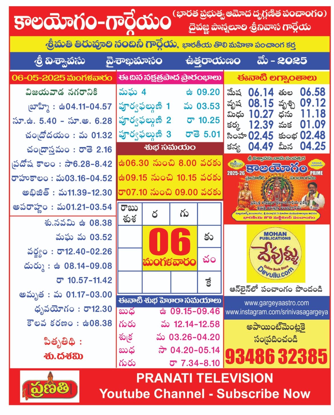 AstrologyBlogsLatestNitya Panchangam Panchangam on 6 MAY 2025 by gargeyaastro May 5, 2025 written by gargeyaastro May 5, 2025 220 0 comment 0 FacebookTwitterPinterestEmail gargeyaastro previous post Panchangam on MAY 5 2025 next post Panchangam on MAY 7 2025 You may also like గోదావరి పుష్కరాలకు ఇదే ఖచ్చిత తేదీ December 16, 2025 శ్రీ చంద్రబాబు నాయుడు గారికి ధన్యవాదములు December 16, 2025 ప్రపంచవ్యాప్తంగా 2 ఆగస్టు 2026 నుంచి భవిష్య ఉద్యోగాలకు గండి... December 16, 2025 please call to 83410 32385 విజయవాడ 2026 జనవరి... December 16, 2025 Panchangam From Dec 11-15 2025 December 14, 2025 Panchangam From Dec 6-10 2025 December 6, 2025 ప్రజలను గందరగోళంలోకి నెట్టిన ఆంధ్రప్రదేశ్ ప్రభుత్వ పండుగల లిస్ట్ December 6, 2025 కేంద్ర ప్రభుత్వ సెలవుల క్యాలెండర్ విడుదలైంది December 6, 2025 కేంద్ర ప్రభుత్వ సెలవుల క్యాలెండర్ విడుదలైంది December 6, 2025 పంచాంగాలలో ఇచ్చే ఆదాయ వ్యయ నిర్ణయాలనేవి ఓ గుడ్డి పద్ధతి December 6, 2025 Leave a Comment Cancel Reply Save my name, email, and website in this browser for the next time I comment.