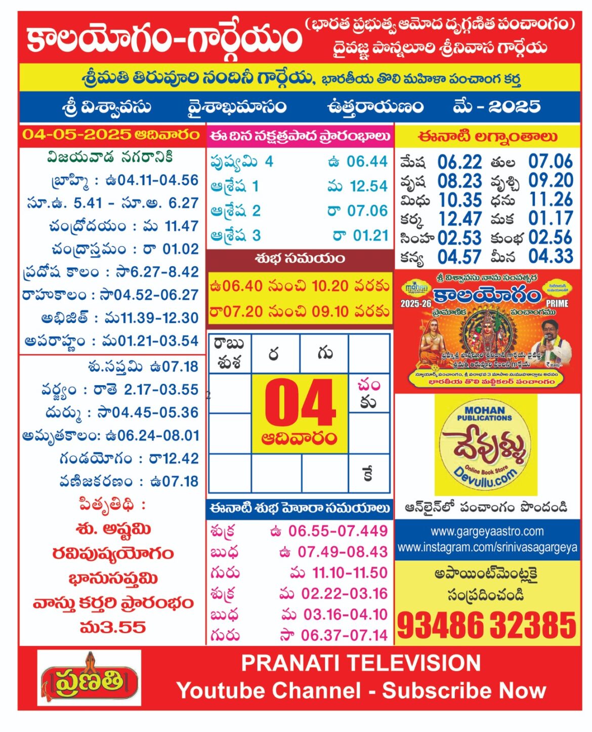 BlogsLatestNitya Panchangam Panchangam on MAY 04 2025 by gargeyaastro May 5, 2025 written by gargeyaastro May 5, 2025 208 0 comment 0 FacebookTwitterPinterestEmail gargeyaastro previous post Panchangam on 3rd may 2025 next post Panchangam on MAY 5 2025 You may also like గోదావరి పుష్కరాలకు ఇదే ఖచ్చిత తేదీ December 16, 2025 శ్రీ చంద్రబాబు నాయుడు గారికి ధన్యవాదములు December 16, 2025 ప్రపంచవ్యాప్తంగా 2 ఆగస్టు 2026 నుంచి భవిష్య ఉద్యోగాలకు గండి... December 16, 2025 please call to 83410 32385 విజయవాడ 2026 జనవరి... December 16, 2025 Panchangam From Dec 11-15 2025 December 14, 2025 Panchangam From Dec 6-10 2025 December 6, 2025 ప్రజలను గందరగోళంలోకి నెట్టిన ఆంధ్రప్రదేశ్ ప్రభుత్వ పండుగల లిస్ట్ December 6, 2025 కేంద్ర ప్రభుత్వ సెలవుల క్యాలెండర్ విడుదలైంది December 6, 2025 కేంద్ర ప్రభుత్వ సెలవుల క్యాలెండర్ విడుదలైంది December 6, 2025 పంచాంగాలలో ఇచ్చే ఆదాయ వ్యయ నిర్ణయాలనేవి ఓ గుడ్డి పద్ధతి December 6, 2025 Leave a Comment Cancel Reply Save my name, email, and website in this browser for the next time I comment.