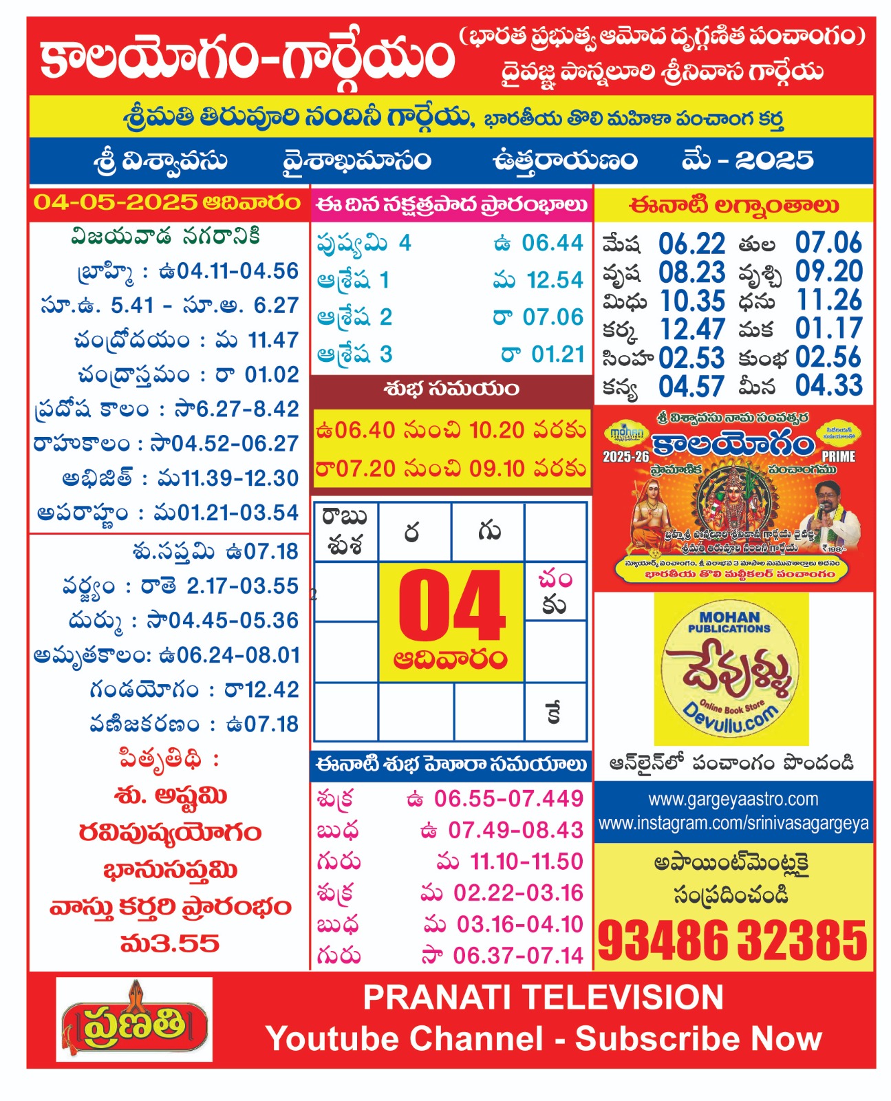 BlogsLatestNitya Panchangam Panchangam on MAY 04 2025 by gargeyaastro May 5, 2025 written by gargeyaastro May 5, 2025 165 0 comment 0 FacebookTwitterPinterestEmail gargeyaastro previous post Panchangam on 3rd may 2025 next post Panchangam on MAY 5 2025 You may also like Pooja timings for 18,20,21 october 2025 October 16, 2025 DIWALI which day in 2025 ? October 13, 2025 Panchangam from 11-15 0ct 2025 October 13, 2025 panchangam from 6-10 2025 October 3, 2025 2 october 2025 Dasara timings for all states September 30, 2025 For Appointments please contact 8341032385 September 30, 2025 Panchangam from 1-5 october 2025 September 30, 2025 For Appointments please contact 8341032385 September 23, 2025 For Appointments please contact 8341032385 September 23, 2025 2025-2033 these 8 years changes in the world September 23, 2025 Leave a Comment Cancel Reply Save my name, email, and website in this browser for the next time I comment.