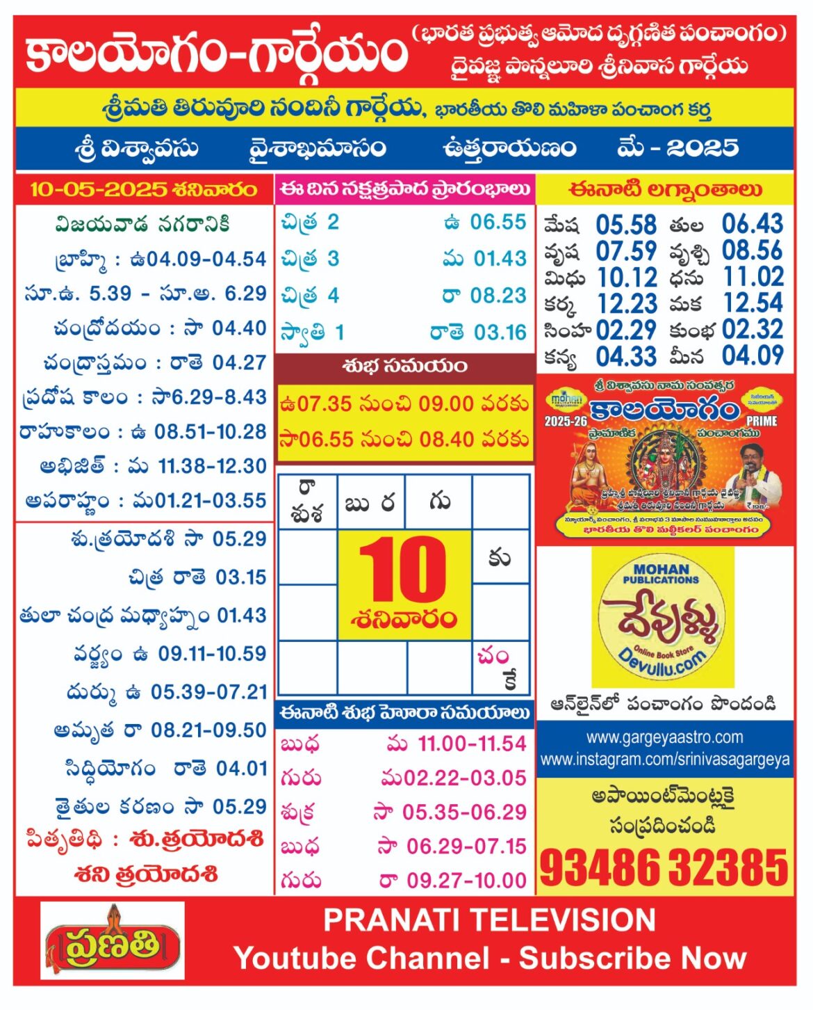 AstrologyLatestNitya Panchangam Panchangam on MAY 10 2025 by gargeyaastro May 6, 2025 written by gargeyaastro May 6, 2025 190 0 comment 0 FacebookTwitterPinterestEmail gargeyaastro previous post Panchangam on MAY 9 2025 next post Good News for Karnataka,Tamilnadu people.For jathakam analysis in JUNE 2025, 2 Days in Bangalore,2 Days in Madras only Appointments are Available,please fill contact form in this Website with all your name ,phone Number,We will get back to you soon with ALL details soon You may also like గోదావరి పుష్కరాలకు ఇదే ఖచ్చిత తేదీ December 16, 2025 శ్రీ చంద్రబాబు నాయుడు గారికి ధన్యవాదములు December 16, 2025 ప్రపంచవ్యాప్తంగా 2 ఆగస్టు 2026 నుంచి భవిష్య ఉద్యోగాలకు గండి... December 16, 2025 please call to 83410 32385 విజయవాడ 2026 జనవరి... December 16, 2025 Panchangam From Dec 11-15 2025 December 14, 2025 Panchangam From Dec 6-10 2025 December 6, 2025 ప్రజలను గందరగోళంలోకి నెట్టిన ఆంధ్రప్రదేశ్ ప్రభుత్వ పండుగల లిస్ట్ December 6, 2025 కేంద్ర ప్రభుత్వ సెలవుల క్యాలెండర్ విడుదలైంది December 6, 2025 కేంద్ర ప్రభుత్వ సెలవుల క్యాలెండర్ విడుదలైంది December 6, 2025 పంచాంగాలలో ఇచ్చే ఆదాయ వ్యయ నిర్ణయాలనేవి ఓ గుడ్డి పద్ధతి December 6, 2025 Leave a Comment Cancel Reply Save my name, email, and website in this browser for the next time I comment.