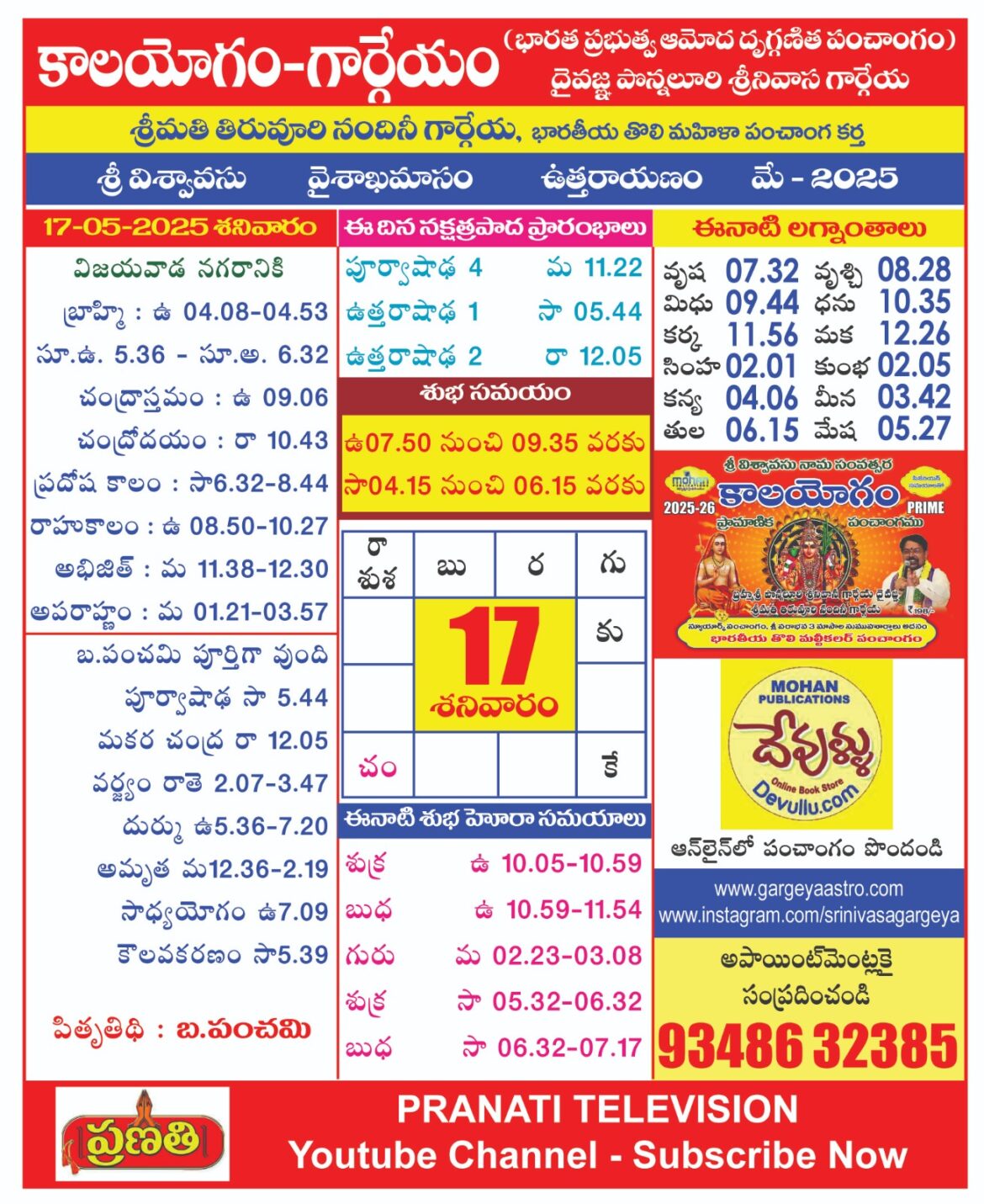 AstrologyLatestNitya Panchangam Panchangam on MAY 17 2025 by gargeyaastro May 16, 2025 written by gargeyaastro May 16, 2025 319 0 comment 0 FacebookTwitterPinterestEmail gargeyaastro previous post Panchangam on MAY 16 2025 next post Panchangam on MAY 18 2025 You may also like గోదావరి పుష్కరాలకు ఇదే ఖచ్చిత తేదీ December 16, 2025 శ్రీ చంద్రబాబు నాయుడు గారికి ధన్యవాదములు December 16, 2025 ప్రపంచవ్యాప్తంగా 2 ఆగస్టు 2026 నుంచి భవిష్య ఉద్యోగాలకు గండి... December 16, 2025 please call to 83410 32385 విజయవాడ 2026 జనవరి... December 16, 2025 Panchangam From Dec 11-15 2025 December 14, 2025 Panchangam From Dec 6-10 2025 December 6, 2025 ప్రజలను గందరగోళంలోకి నెట్టిన ఆంధ్రప్రదేశ్ ప్రభుత్వ పండుగల లిస్ట్ December 6, 2025 కేంద్ర ప్రభుత్వ సెలవుల క్యాలెండర్ విడుదలైంది December 6, 2025 కేంద్ర ప్రభుత్వ సెలవుల క్యాలెండర్ విడుదలైంది December 6, 2025 పంచాంగాలలో ఇచ్చే ఆదాయ వ్యయ నిర్ణయాలనేవి ఓ గుడ్డి పద్ధతి December 6, 2025 Leave a Comment Cancel Reply Save my name, email, and website in this browser for the next time I comment.