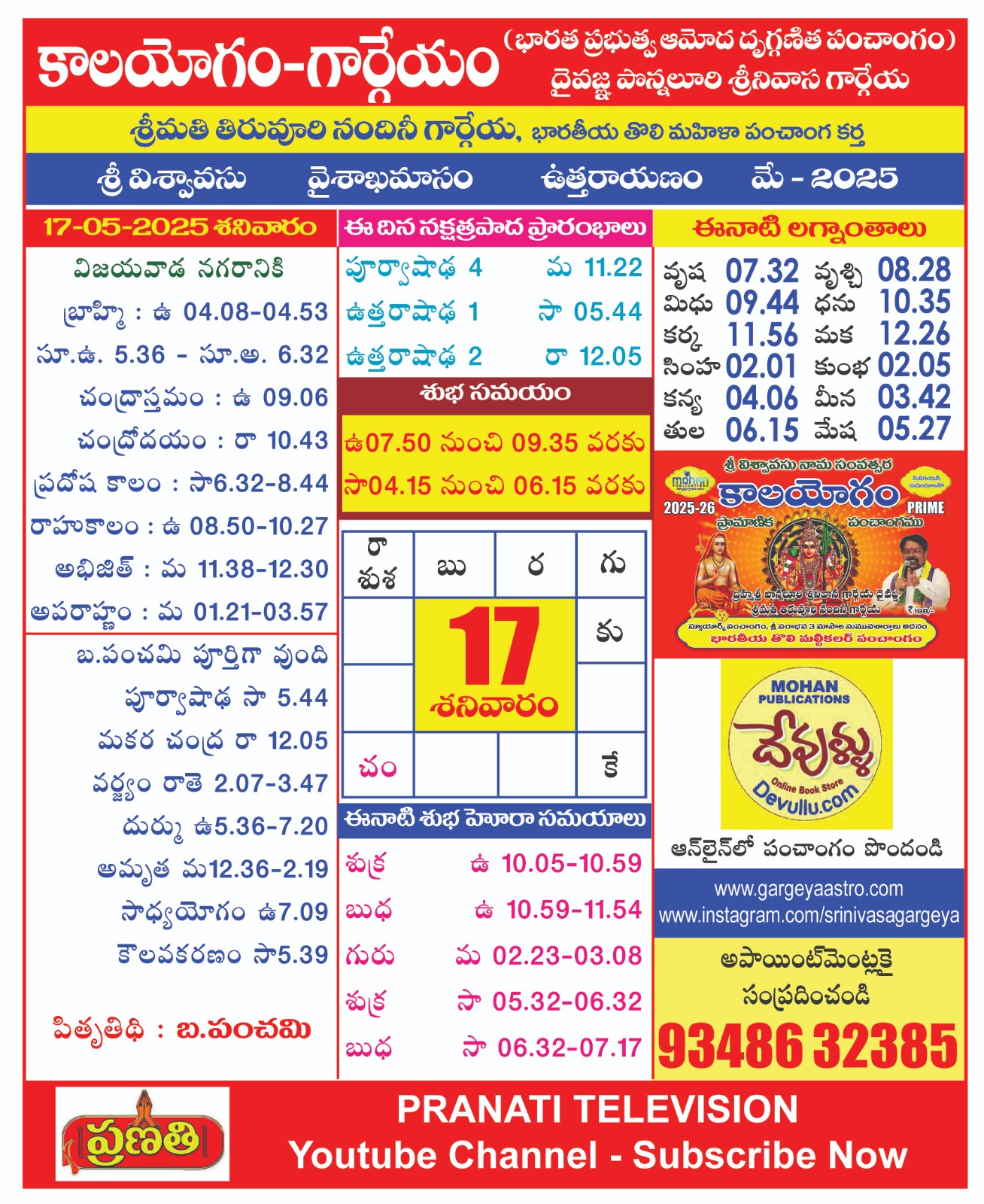 AstrologyLatestNitya Panchangam Panchangam on MAY 17 2025 by gargeyaastro May 16, 2025 written by gargeyaastro May 16, 2025 274 0 comment 0 FacebookTwitterPinterestEmail gargeyaastro previous post Panchangam on MAY 16 2025 next post Panchangam on MAY 18 2025 You may also like Pooja timings for 18,20,21 october 2025 October 16, 2025 DIWALI which day in 2025 ? October 13, 2025 Panchangam from 11-15 0ct 2025 October 13, 2025 panchangam from 6-10 2025 October 3, 2025 2 october 2025 Dasara timings for all states September 30, 2025 For Appointments please contact 8341032385 September 30, 2025 Panchangam from 1-5 october 2025 September 30, 2025 For Appointments please contact 8341032385 September 23, 2025 For Appointments please contact 8341032385 September 23, 2025 2025-2033 these 8 years changes in the world September 23, 2025 Leave a Comment Cancel Reply Save my name, email, and website in this browser for the next time I comment.