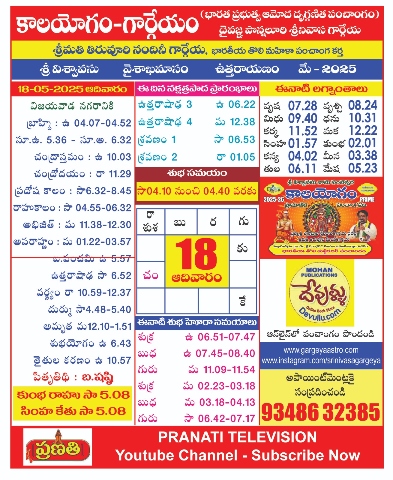 AstrologyLatestNitya Panchangam Panchangam on MAY 18 2025 by gargeyaastro May 16, 2025 written by gargeyaastro May 16, 2025 306 0 comment 0 FacebookTwitterPinterestEmail gargeyaastro previous post Panchangam on MAY 17 2025 next post Panchangam on 19 MAY 2025 You may also like Pooja timings for 18,20,21 october 2025 October 16, 2025 DIWALI which day in 2025 ? October 13, 2025 Panchangam from 11-15 0ct 2025 October 13, 2025 panchangam from 6-10 2025 October 3, 2025 2 october 2025 Dasara timings for all states September 30, 2025 For Appointments please contact 8341032385 September 30, 2025 Panchangam from 1-5 october 2025 September 30, 2025 For Appointments please contact 8341032385 September 23, 2025 For Appointments please contact 8341032385 September 23, 2025 2025-2033 these 8 years changes in the world September 23, 2025 Leave a Comment Cancel Reply Save my name, email, and website in this browser for the next time I comment.